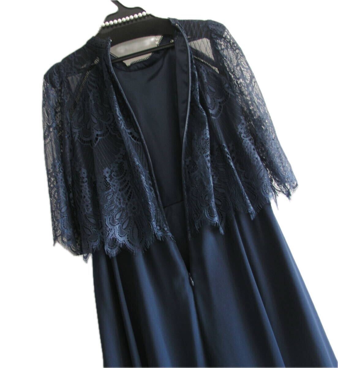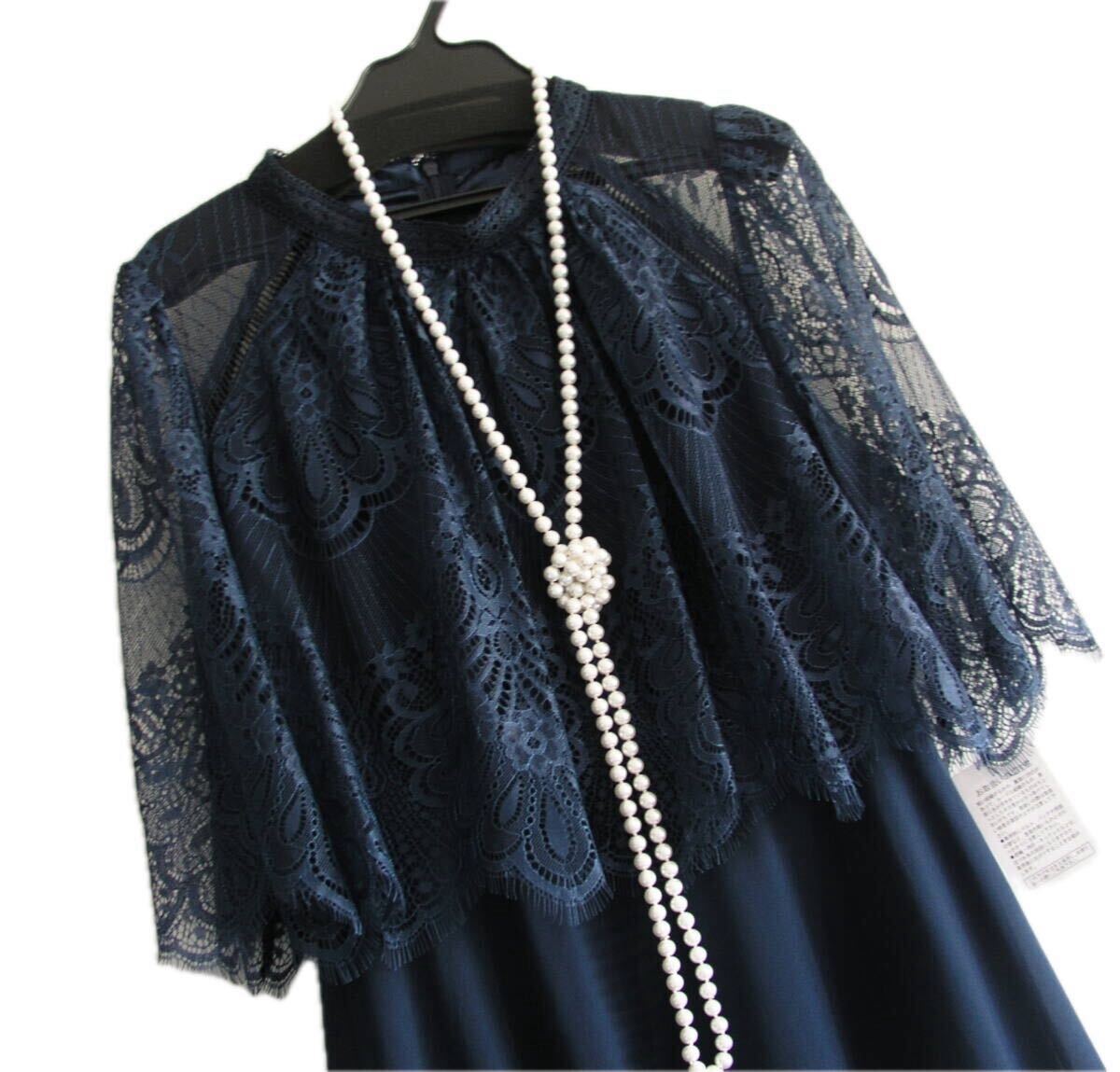 平置き実寸:着丈(前)107、(後ろ)120、肩幅37、袖丈34、脇下身幅約46、切替ウエスト部分35~40、ヒップ約65 ** 実寸サイズにつきましては、多少の誤差はお許しください。 素材: レース部分:ナイロン100、 レーステープ部分:ポリエステル100 シフォン部分:ポリエステル100 裏地:ポリエステル100 カラー:ブルー紺 ※カラーに関しては、一般的に見えるお色を記載しております。 ネックレスは附属しません | ||