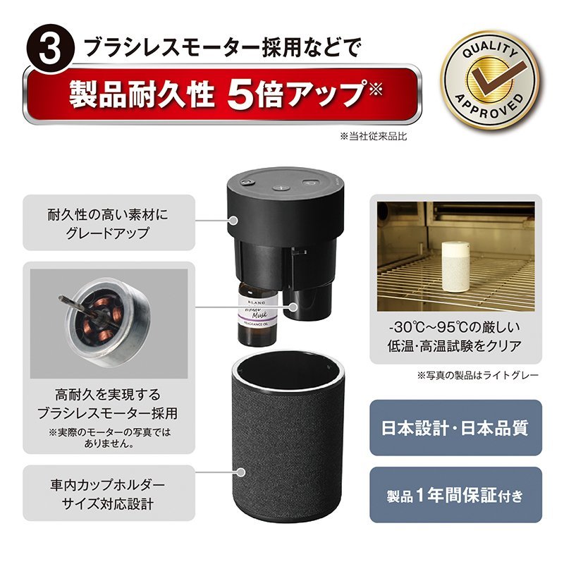 ■微香からモンスター級まで、香りをコントロールできるフレグランス ■瞬時に香り広がる 高圧噴霧ノズルで、フレグランスオイルを空気微粒子に変換し噴霧。 ■大型車も香りで充満できる芳香パワー 芳香剤を何個も使わないと香りが 楽しめなかった大型車もこれ一台で充分に香りをいきわたらせることができます。 ■4段階に香りのコントロール センサーボタン一つ操作するだけで、 微香からモンスター級まで好みの強さに調整できます。 ■エンジンONで自動噴霧 前回の設定レベルを記憶して、通電時に自動で噴霧を開始します。 ■安心設計 全てのモードで2時間オートオフ機能搭載 ■簡単ボトル交換ボトルを交換するだけ。香りチェンジもOK。 ■専用フレグランスオイルは別売りです。 (ブラング、ルーノどちらのフレグランスオイルも使用可能です) レベル2-1日1時間使用で約8.5か月使用できます。 |