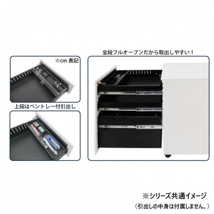 | 平机や作業机など収納がついていない机におすすめのキャスター付きサイドワゴンです。 |