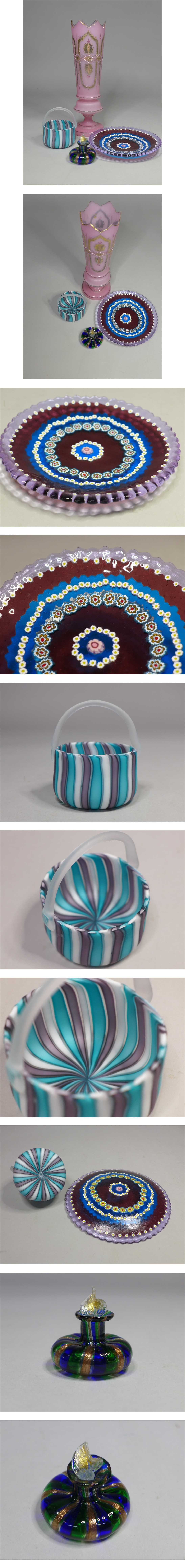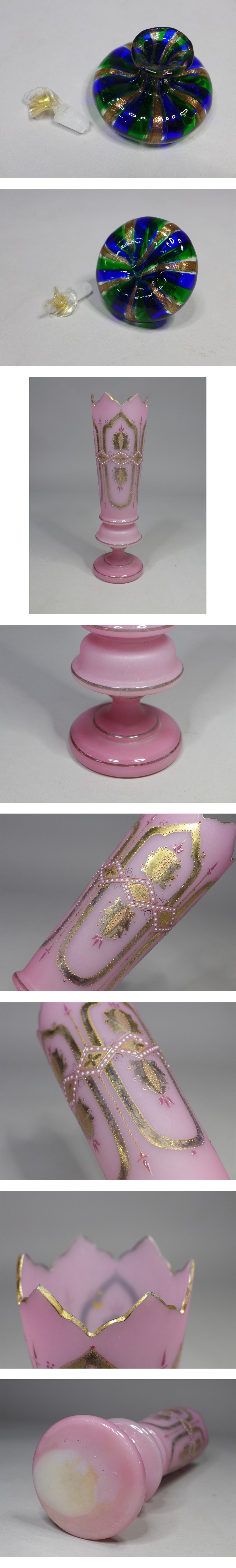 フラワーベース高さ約32,5cm・プレート約19,3cmです。素晴らしい意匠のガラス製品です、お好きなかたどうぞ!ピンクの花瓶には時代感部分が見えます。その他の物はおおむね良好です、内容や状態などは画像参照でお願いします。