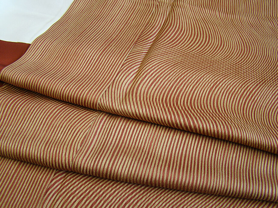 | 商品説明 | こちらのお品は「袷」ですので10月から5月までお召頂ければと思います。 とてもしなやかなさらりとした手触りの着心地良い重めの滑らかな極上ちりめん地の生地、 赤茶色とベージュ色のよろけ縞柄の染柄、 八掛は赤茶色(正絹)、幅広い年代の方にお召頂けます。 |