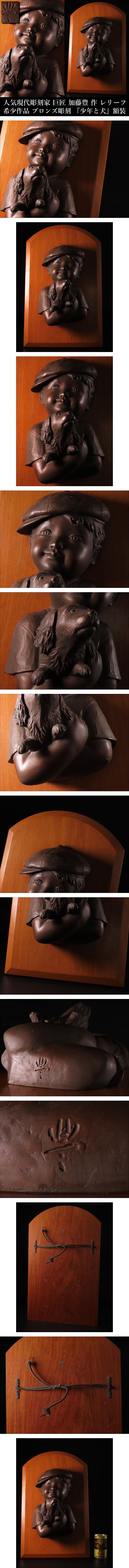 【ONE'S】人気現代彫刻家 巨匠 加藤豊 作 レリーフ 希少作品 ブロンズ彫刻 『少年と犬』 額装 壁掛 高47cm 重量5.55kg 美術品 | |||