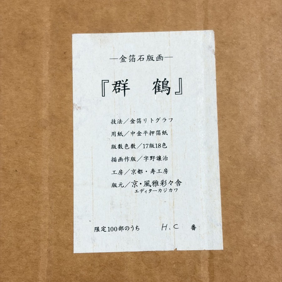 | ○ 尾形光琳 【群鶴】 金箔リトグラフ 複製画 作版 宇野譲治 京都・寿工房 証明シール 模写 限定100部のうち H.C番 ○K02-0203 |