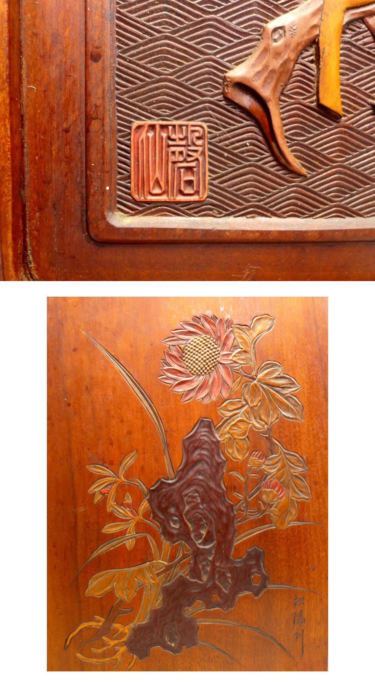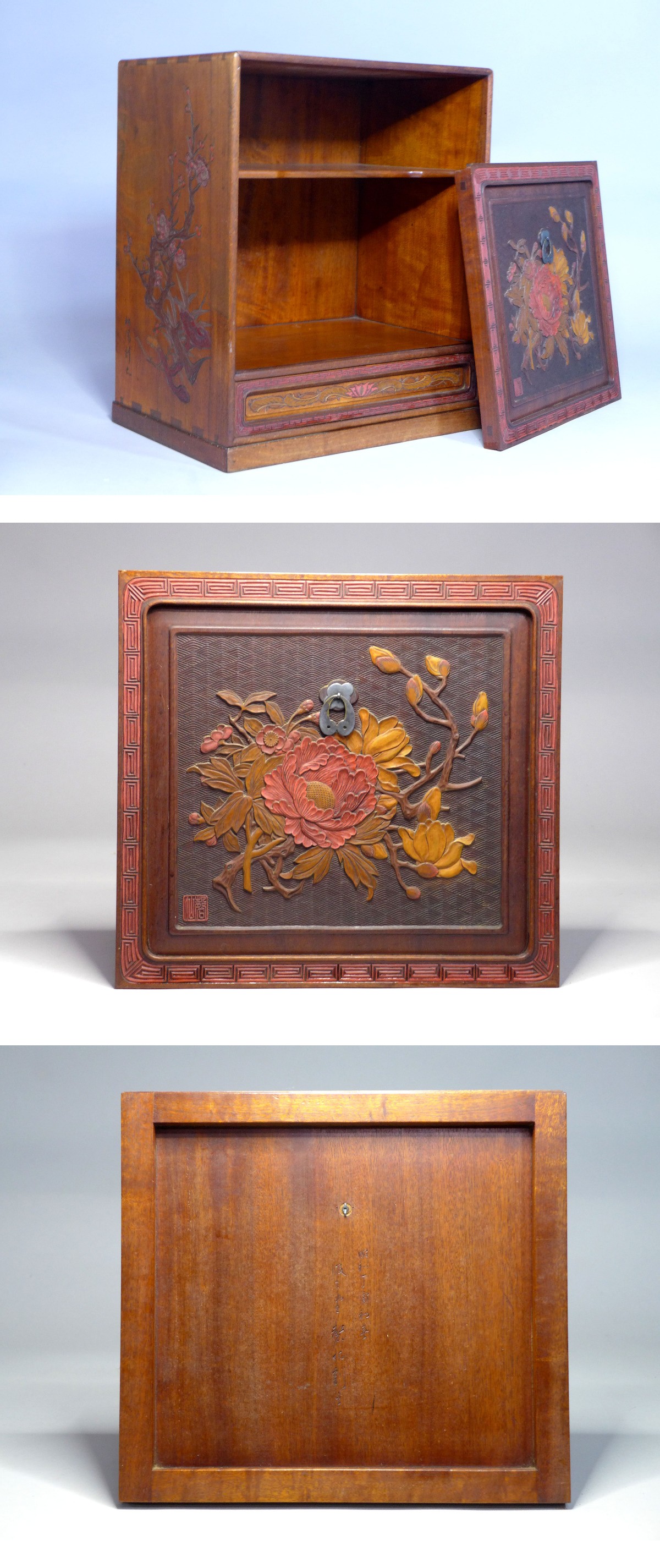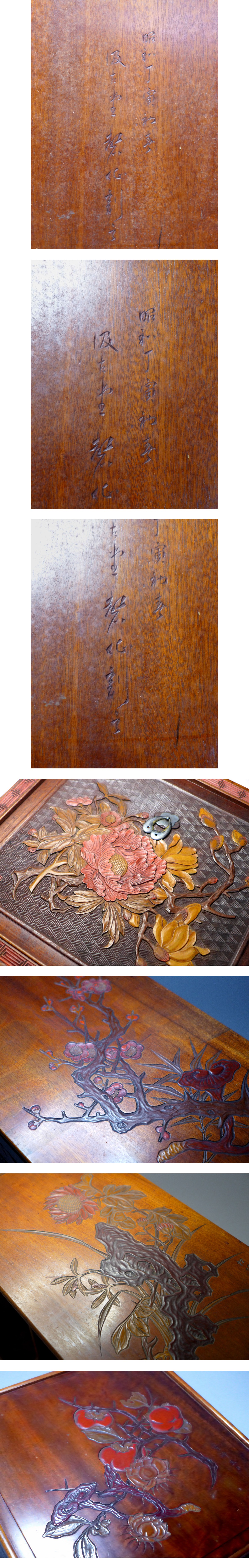 高:約42・3cm。巾:約36・8cm。奥行:約25・5cm。『吸古堂磬仙造 他松陽刻尋師生刻 3合作 讃岐彫木彫彩色総面彫器局』です。吸古堂磬仙、松陽刻、尋師生刻の3人の合作です。天部は蝙蝠が彫刻されています。前面の蓋を差し込む時に、少々きついです。総じて状態も良く非常に貴重な作品です。状態は画像参照でお願いします。★★★★★★★★★★★★★★★★★★★★★★★★最近、悪質な入札者が多く非常に迷惑をしております。新規IDや「非常に悪い・悪い」の評価の多い方の入札はお断りさせて頂きます。 仮に入札があった場合でも、発見次第入札を削除させて頂く場合がございます(判断基準は弊社判断によります事予めご了承下さい)。 また、そのような方で入札を希望する場合は《入札者への質問》へ、入札する旨を必ずご連絡ください。 ご連絡がない場合の入札も削除対象となります。 かつ、その落札者様の当方へのご入札を今後一切お断り致しますのでご了承ください。★★★★★