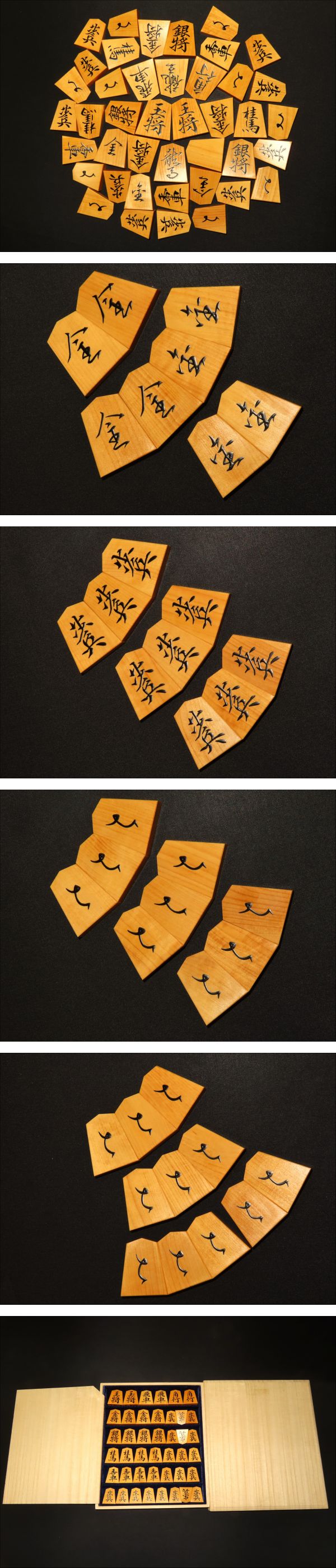 木地は御蔵島黄楊。「赤柾」と謳って問題ないと思いました。ご覧の通り非常に味の良い木地です。全ての駒の表裏をUPいたしましたので是非ご覧ください(木地種表記は私見です写真でご確認をお願いいたします)。