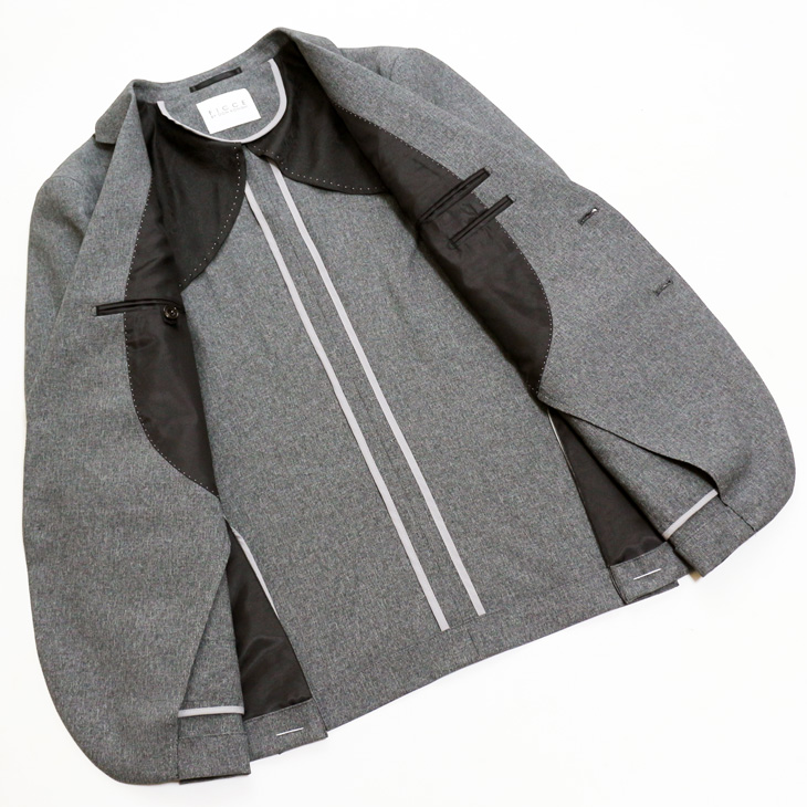 肩パットレス、大見返しのアンコン仕立て、背抜き各部パイピング補強 通常スーツ同様に背裏、袖裏、ズボンの膝裏地付きです。 生産国:中国製*仕上げプレスは国内で施しております。 |