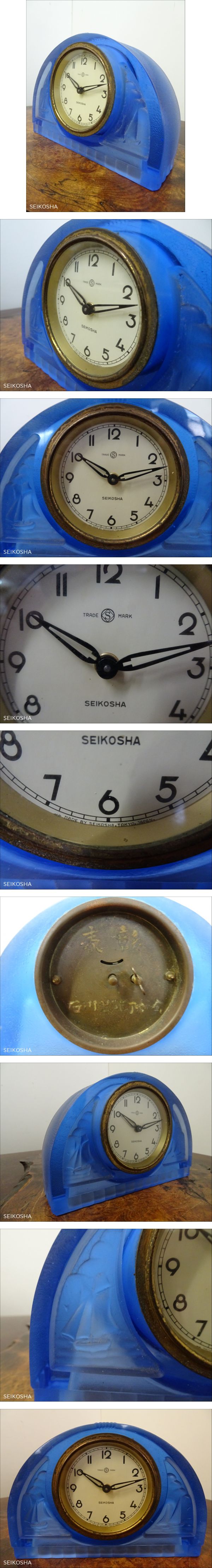 精工舎 SEIKOSHA 青(ブルー)ガラス 硝子枠 ヨット柄 置時計 ジャンク/時代物/アンティーク | |||||||||||||||