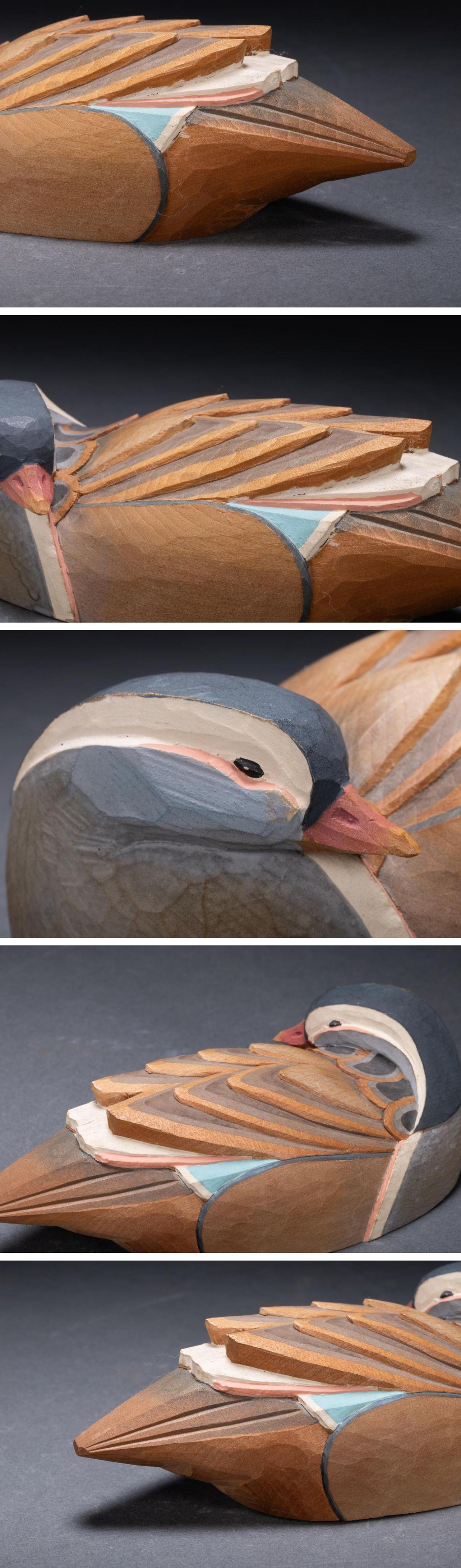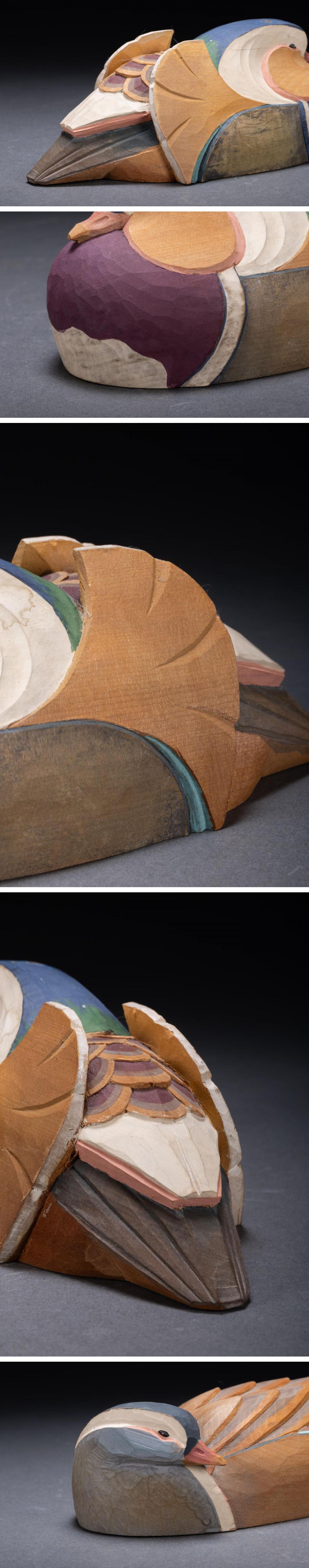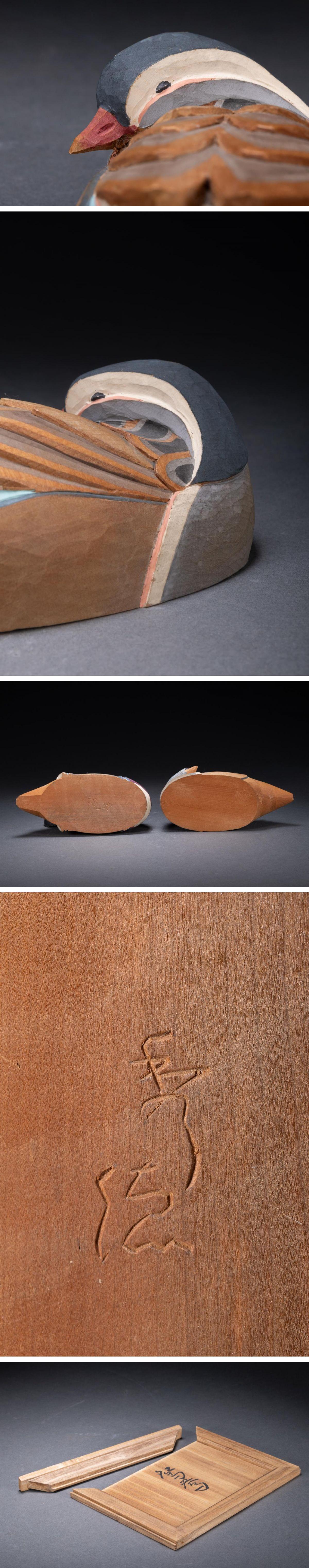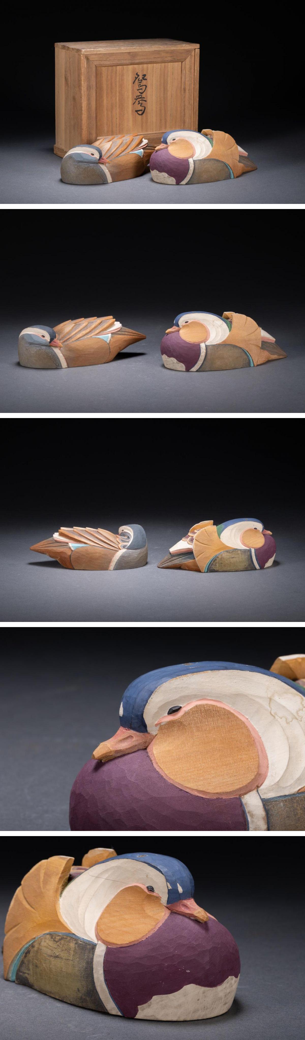 【雲錦】1円から 時代物 色絵木彫り 鴛鴦文置物一双「秀徳」刻 共箱 古美術 骨董品7L10-124S07