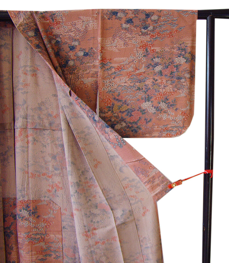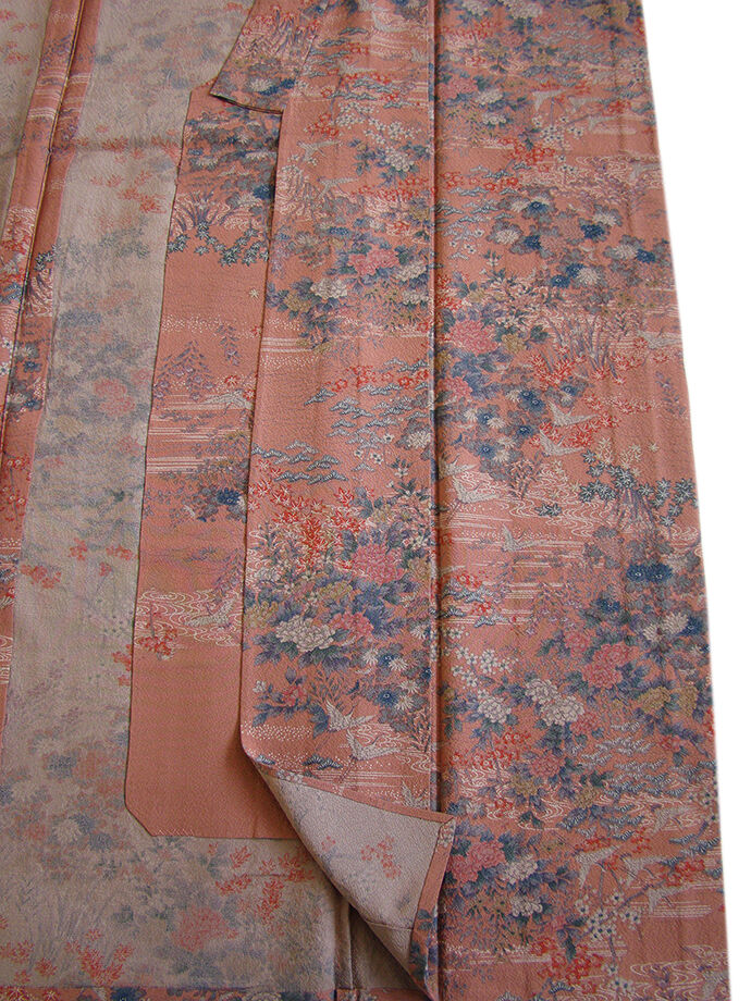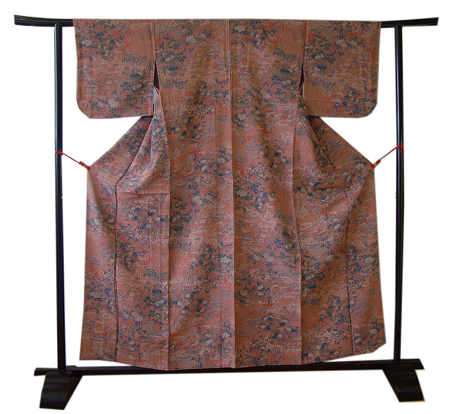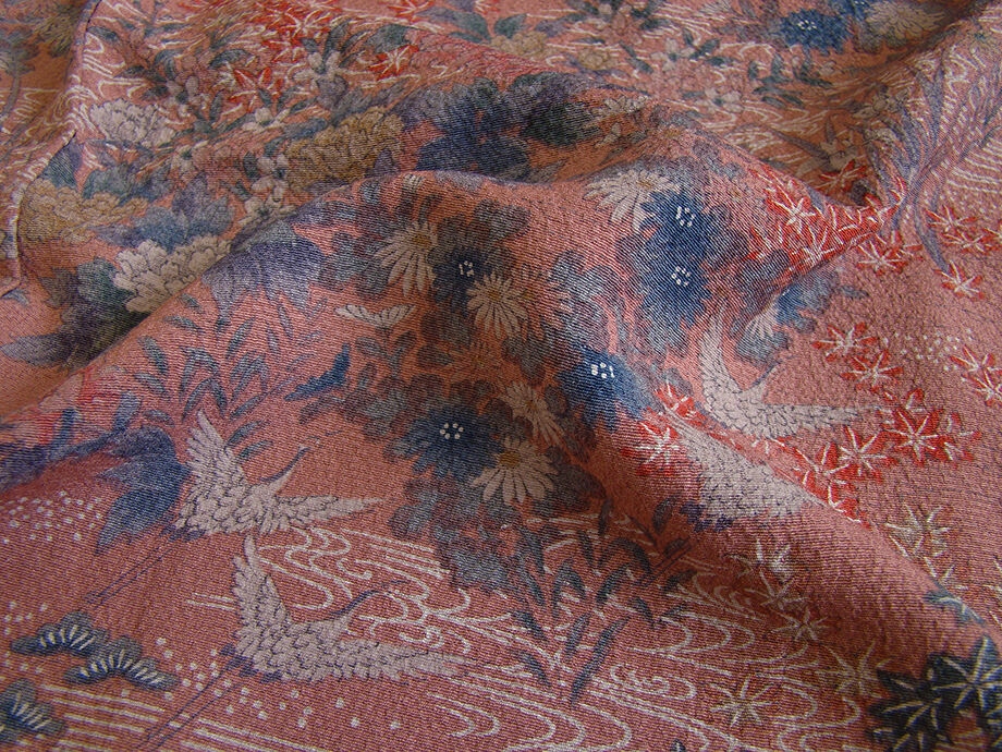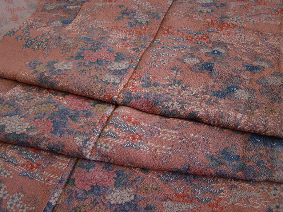 | 商品説明 | こちらのお品は「単衣」ですので、5月、6月、9月にお召頂ければと思います。 着物には、大きく分けて「袷(あわせ)の着物」と「単衣(ひとえ)の着物」と「夏着物」があります。 反物(表地)を着物に仕立てるときに、裏地類をつけるものを袷の着物、 つけないものを単衣の着物と呼び、胴裏や八掛といった裏地がつかない一枚ものの着物です。 また裏地がないため、座る時などにヒップのラインが目立たないよう、 居敷当て(いしきあて)の生地をつけることもあります。 共布の居敷当て1巾付いております。 しなやかなさらりとしたちりめん地の生地で涼やかな風合いを醸しております。 渋い蘇芳香色地に松竹梅や鳥、花木等の染柄、 また、バチ衿仕立てとなっております。 |