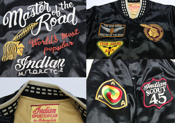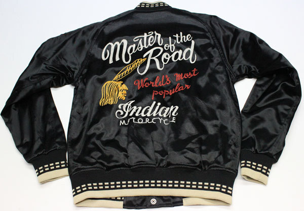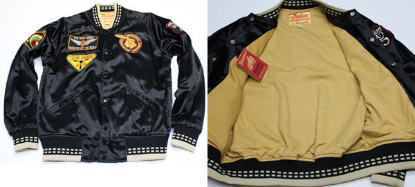 インディアン 【INDIAN MOTORCYCLE】サテンジャケットで60年代の復刻で裏面の刺繍はチェーンステッチで前面は両胸&両袖にパッチ付でかなり良い雰囲気で色は黒色で素材は表地はレーヨン50%綿50%裏地綿は100%で品番IM11285です。