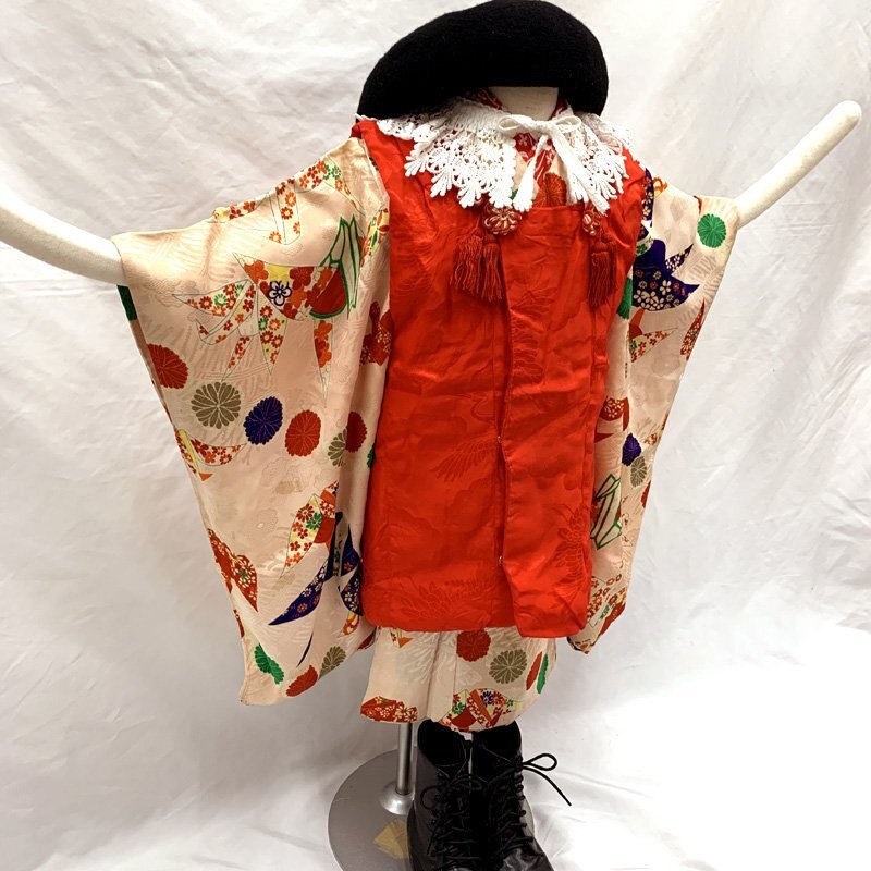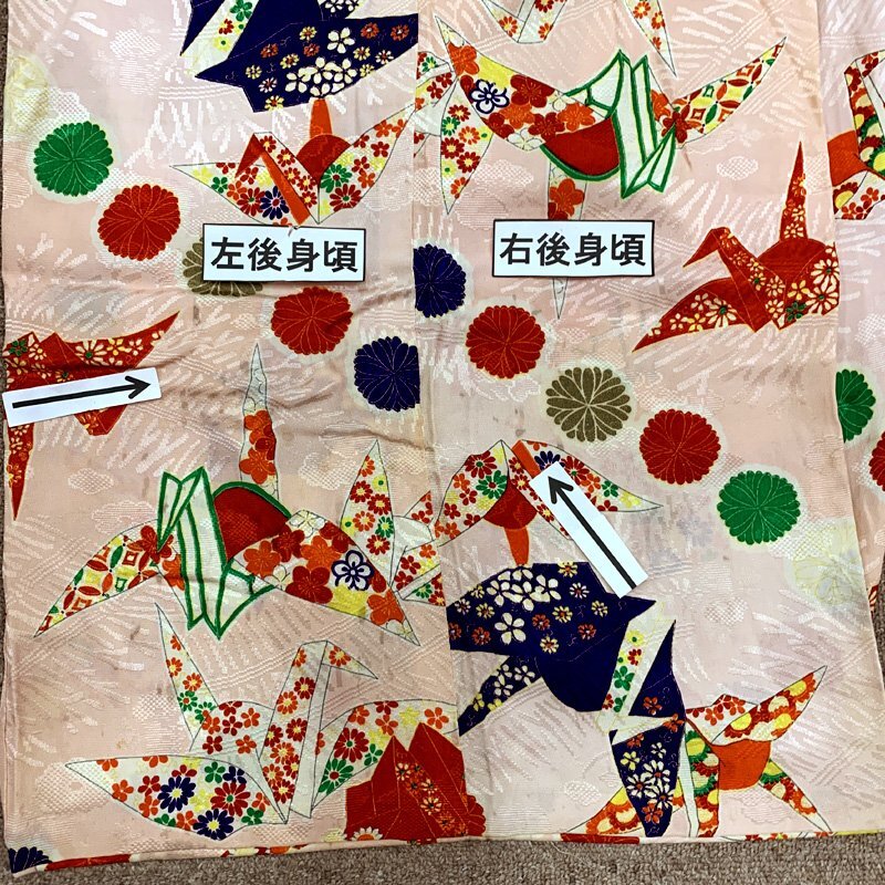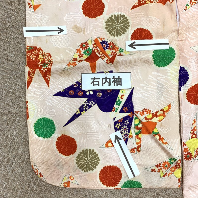 | □七五三 三歳 女児 アンティーク 着物&被布 折り鶴 菊文□状態良好 (No.ed) 人気のアンティーク着物。桜色やシェルピンク地に、折り鶴や菊文が可愛らしい七五三3歳のレトロなお着物セットです。 こちらの商品は着物、被布です。その他の小物はセットに含まれません。 (着物)身幅広め。腰上げがされていないので、お子様の身丈に合わせてお直しお願いします。右の掛け衿部分にシミがございますが着用時見えません。右外袖や左外袖にシミございますが遠目からみたらあまり目立ちません。左右後身頃の矢印部分に汚れのようなものがございますが遠目からみたらあまり分かりません。アンティーク着物なので、所々にシミがございますがご了承ください。 (長襦袢)こちらには長襦袢が付属いたしません。代わりにお子様の負担が少なく便利な「子ども用楽々衿」をお勧めします。#ag楽々衿 (被布)左前身頃に汚れがございますが遠目から見たらあまり分かりません。また、左後身頃の矢印部分に黒っぽい汚れのようなものがございますが遠目からみたらあまり目立ちません。 【素材】(着物)正絹、(被布)正絹 【色】桜色・シェルピンク系 *モニターによって色味は実際と異なる場合がございます。 【サイズ】(着物) 裄:38cm、肩上げ幅:5.2cm、袖幅:28cm、袖丈:57cm、丈(肩から):93cm、腰上げ幅:0cm、前幅:19cm、後幅:23cm (被布) 幅:54cm、丈(肩から):cm *素人採寸のため、多少の誤差はご容赦ください。 アンティーク着物で古い物ですので、それなりのシミや汚れ、ほつれなどダメージ等あるかと思います。現在出回っているアンティーク着物はシミやアクなどのダメージや手直しなど難がある事の方が多いです。多少の目立たないシミやアクに関しては記載をしておりませんので、ご了承ください。新品同様の綺麗さをご希望の方、少しのシミやアク、ほつれなどアンティークに御理解頂けない方のご購入はお控えいただきますよう、お願いします。 | |