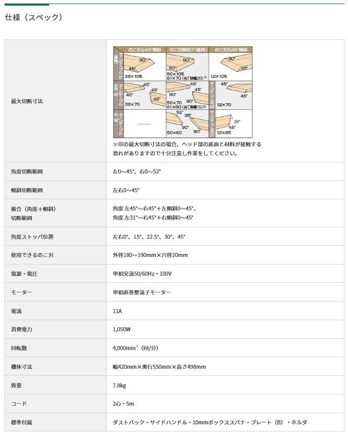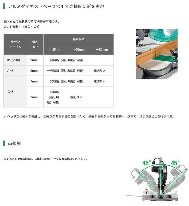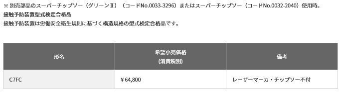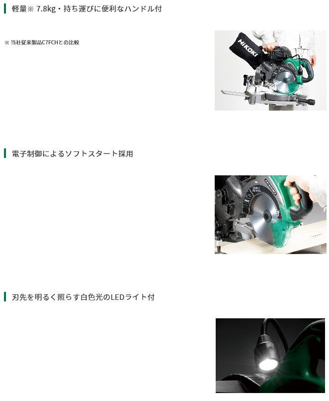 | 【商品説明】 HiKOKI ハイコーキ 190mm 卓上 丸のこ C7FC新品になります。 アルミダイカストベース採用で高精度切断を実現 幅木を立てた状態で角度切断が可能です。 のこ刃傾斜0°(直角)の時 両傾斜 左右45°まで傾斜可能。材料を反転させずに傾斜切断できます。 両傾斜 軽量※ 7.8kg・持ち運びに便利なハンドル付 ※当社従来製品C7FCHとの比較 持ち運びに便利なハンドル 電子制御によるソフトスタート採用 ソフトスタート 刃先を明るく照らす白色光のLEDライト付 ※ 別売部品のスーパーチップソー(グリーンⅡ)(コードNo.0033-3296)またはスーパーチップソー(コードNo.0032-2040)使用時。 本品にはチップソーは付属しておりません別売りになります。 接触予防装置型式検定合格品 接触予防装置は労働安全衛生規則に基づく構造規格の型式検定合格品です。 ※スペックや付属品の詳細はメーカーホームページをご確認ください。 在庫状況が常時変動しております必ず購入前にご質問ください。 ※本商品は改良や定期的に仕様変更される場合がり実際の写真と異なる場合がございますが同型番の改良された商品は新型の商品となりますのでご了承ください。 スペック等の変更はございませんご安心してお使いください。本品は別倉庫に在庫がある為入金確認後から納期が数日かかりますご了承の上ください。 ※また製品改良のため、素材・形状など一部仕様が変更になる場合がございますが、機能・品質等使用上は問題なくご使用になれますのでご安心ください。 改良や仕様変更された商品は実際の写真と異なる場合がございますが同型番の改良された商品は新型の商品となりますのでご了承ください。 本商品のメーカーでは仕様変更及び改良はメーカーで常時行われております画像にございます工具等は付属しておりませんご注意ください。 画像は代表イメージです。 本品は新品、未使用品ですが箱等に多少の汚れ細かな傷等がある場合がございますご了承ください。 完璧な商品を求める神経質な方はご入札なされないようお願いいたします。 ノークレーム、ノーリターン、ノーキャンセルでお願いいたします。 上記の記載をご理解の上ご購入のご検討をお願い致します。 【お支払方法】 ゆうちょ銀行、 ジャパンネット銀行 楽天銀行 【発送について】 沖縄・離島は別途送料がかかりますので、お問い合わせください。 注意事項 当店での出品中の商品は店頭と他サイトとの同時販売の為在庫切れなどの場合もございます、在庫切れの場合納期がかかります入札前に必ずご質問ください。 送料と振込手数料はお客様ご負担になります入金の確認後発送とさせていただきます。送料料金に関しましては梱包手数料梱包費が含まれております。 商品説明にもございますよう、多少の汚れ等ございます。完璧な商品を求める方は、入札をお控ください。 お客様都合による返品・交換は一切受け付けておりませんので、必ず詳しい程度をご確認の上ご入札下さい。気になることがございましたらご遠慮なく質問して下さい。 発送時期によりパッケージの仕様の変更が常に行われております中身自体は同等品ですが梱包パッケージや柄が変わる場合がございますご了承ください。 撮影時の状況及びお客様のPC環境等の諸事情により実際の色目と違って見える場合がございますのでご理解のうえご入札お願い致します。 在庫切れ等の場合出来る限り早急発送を心掛けておりますが、出荷まで数日かかる場合がありますので、お急ぎのお客様は在庫等お問合せ下さい 配送に補償がついておりません補償発送をご希望の方は申し出ください。ノークレーム、ノーリターンノーキャンセルでお願い致します。 土、日曜日、祝祭日、はネット業務はお休みのため、商品の発送及びご連絡等、質問への解答 が休日あけに遅なる場合がございますがご了承ください。 管理番号HiKOKI ハイコーキ 190mm 卓上 丸のこ C7FC |