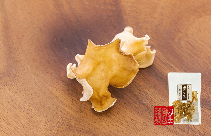 | 使用方法 | 1.沸騰したお湯にきくらげを入れ約1分間茹でます。2.火を止め余熱で約20~30分かけて戻します。※水やぬるま湯で戻した場合は必ず熱湯で30~40秒湯がいてからご使用ください。戻した際、黄色っぽい白色や黒っぽい白色になる部分もございますが、白いきくらげの特長で品質上問題ありません。 |