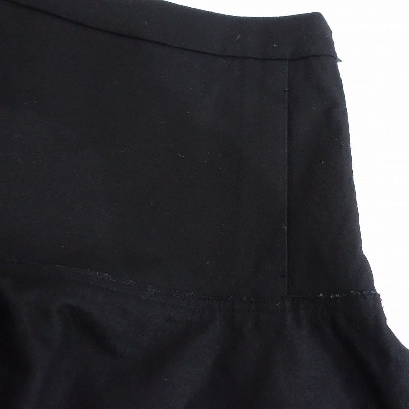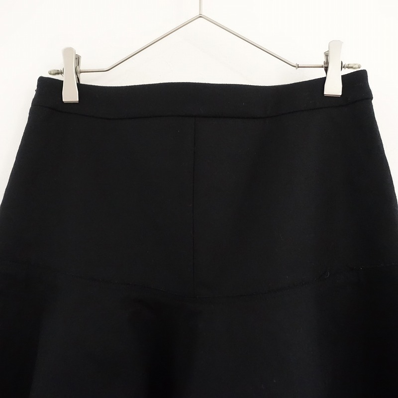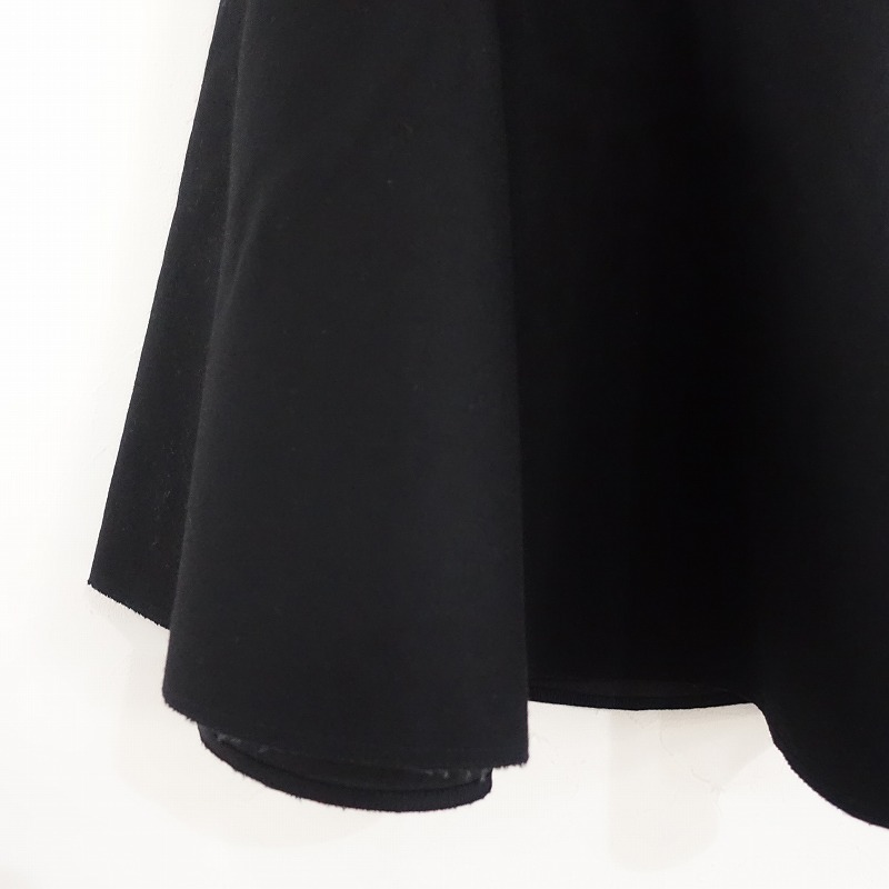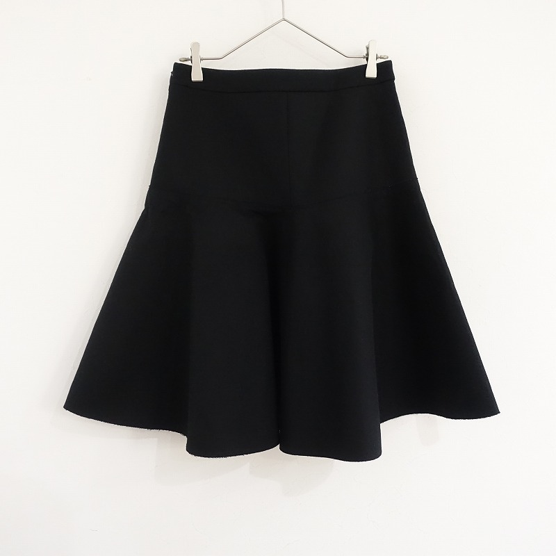 | Drawerのウールフレアスカートです。カラーはブラックで、張り感のある微起毛地で仕立てられており、裏地が付いております。切替部や裾はカットオフ仕様で、フレアなシルエットになっており、フロント両サイドにポケットが付いております。 |