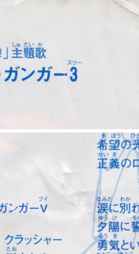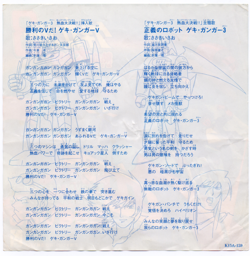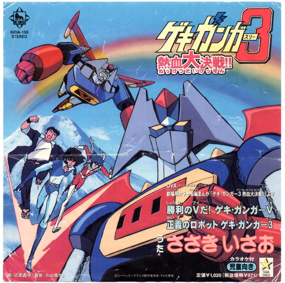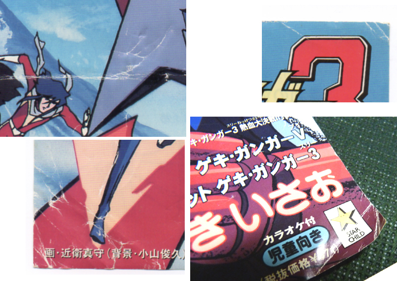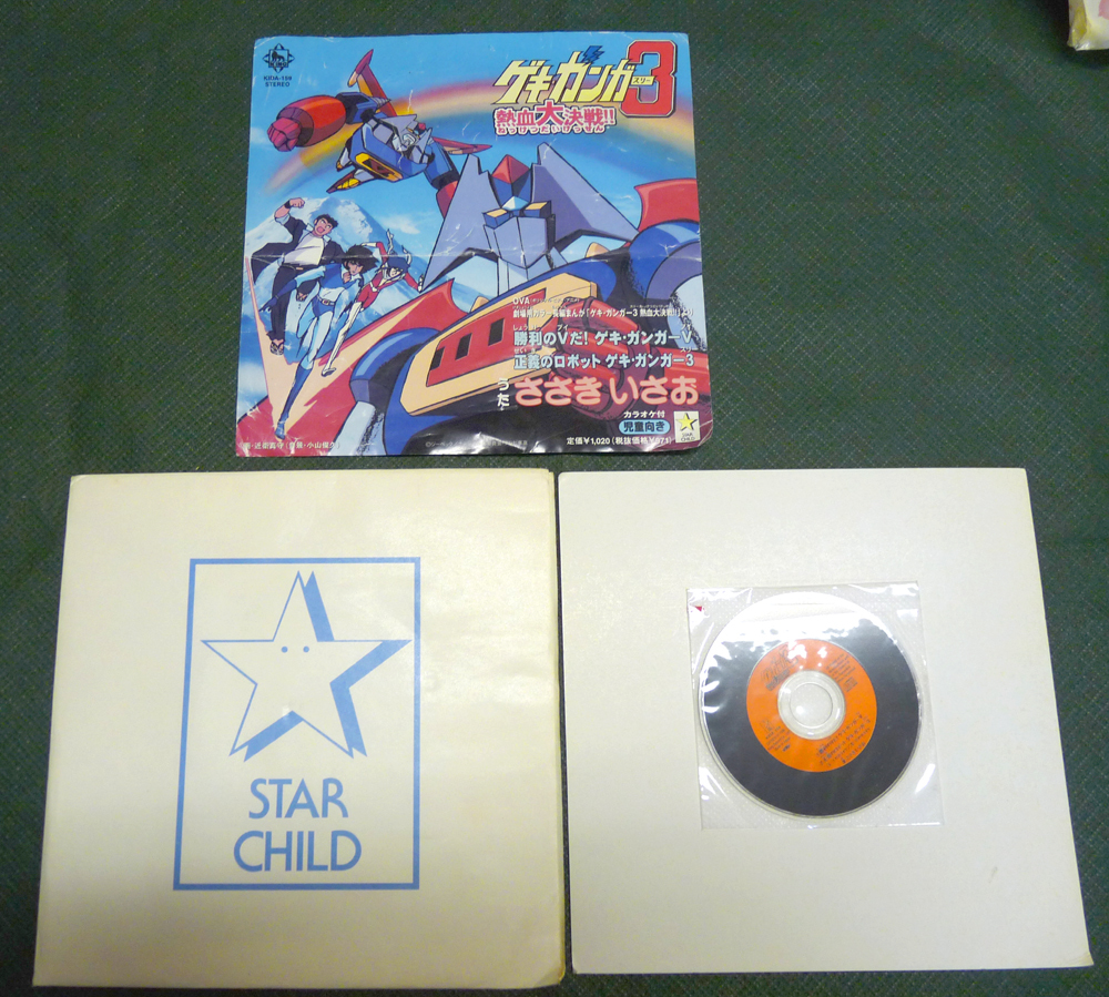 OVA 劇場用カラー長編まんが「ゲキ・ガンガー3 熱血大決戦!!」より 勝利のVだ!ゲキ・ガンガーV / 正義のロボット ゲキ・ガンガー3 カラオケ付き 児童向き KIDA159 ステレオ 画/近衛真守 全体のサイズ:180x180mm ☆状態★ジャケットは傷んでいますが、CDは問題ありません。 CDディスク:当方のプレイ環境では、不具合等はありませんでした。 目視ではディスク表面に傷やカビなどはありません。 歌詞カード:表面スレ、折れ、ヨレ、へこみ、ヤケがあります。 紙袋 :軽い汚れがあります。 画像に写っているものがすべてです。 外観の印象等は当方の主観によるところですので、著しく違わない限りは ご理解いただけますと幸いです。 | ||||
