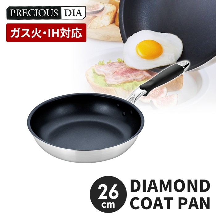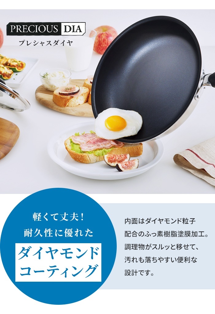 | 【PRECIOUS DIA|プレシャスダイヤ】 軽くて丈夫!耐久性に優れたダイヤモンドコーティング。 合理的肉厚軽量構造(厚底、薄側面)で厚底(2.4mm)なのに、軽いのが特徴です。 全ての熱源に対応しています。(※電子レンジには使用できません) |