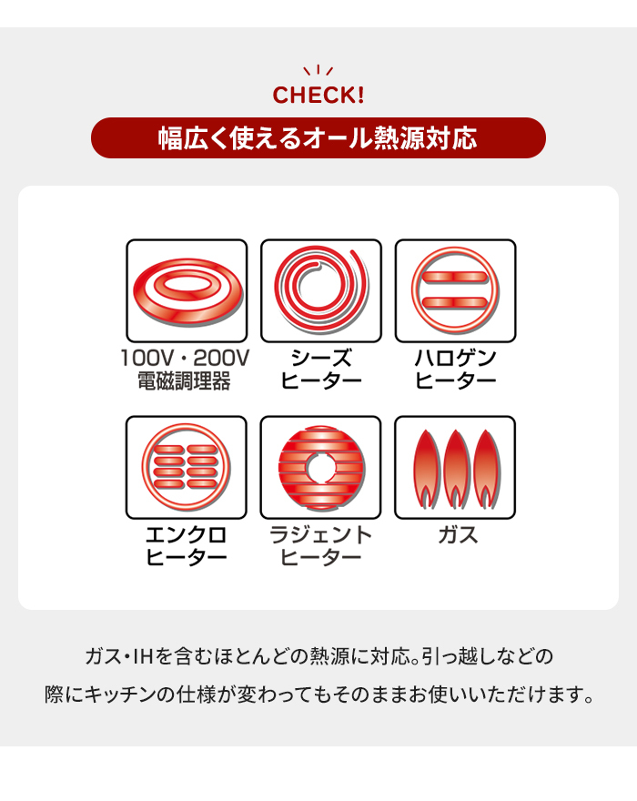 | 200V|オール熱源対応 ◎全ての熱源に対応しています。 (※電子レンジには使用できません) ・電磁調理器 ・ガスコンロ ・エンクロヒーター ・ラジェントヒーター ・ハロゲンヒーター ・シーズヒーター |
