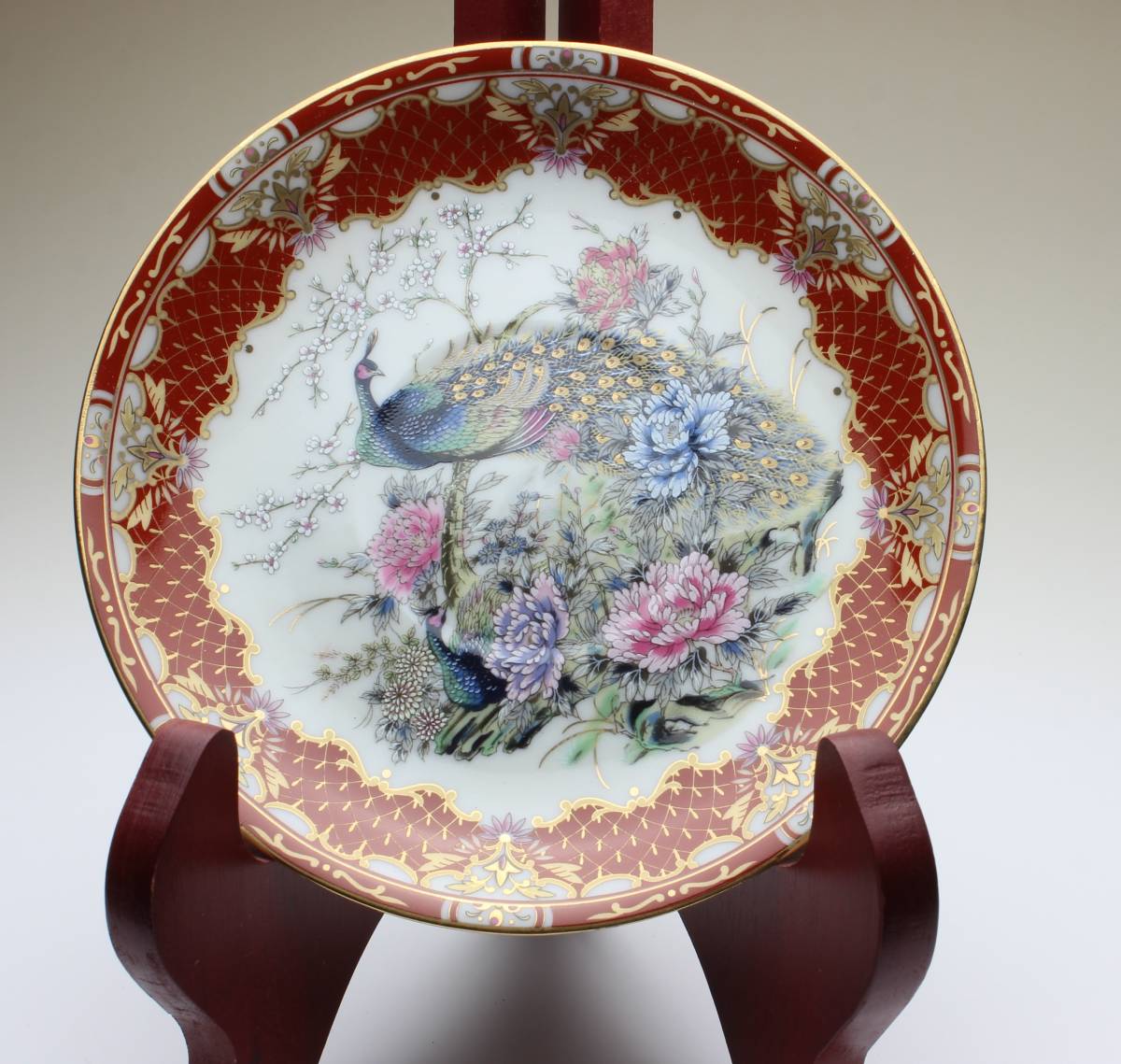 孔雀をモチーフに、菊や梅をあしらった東洋的なデザイン。