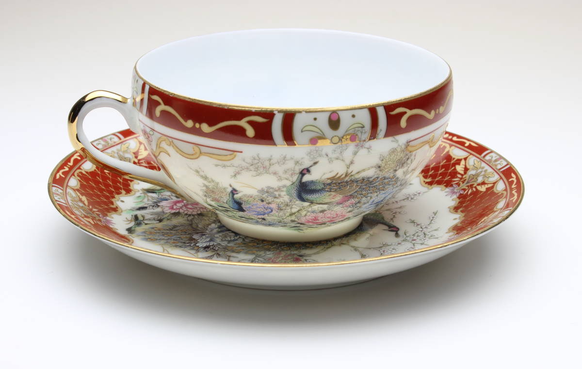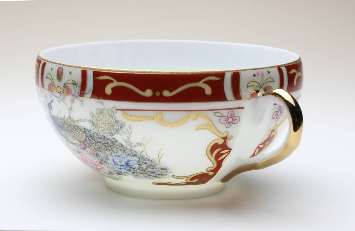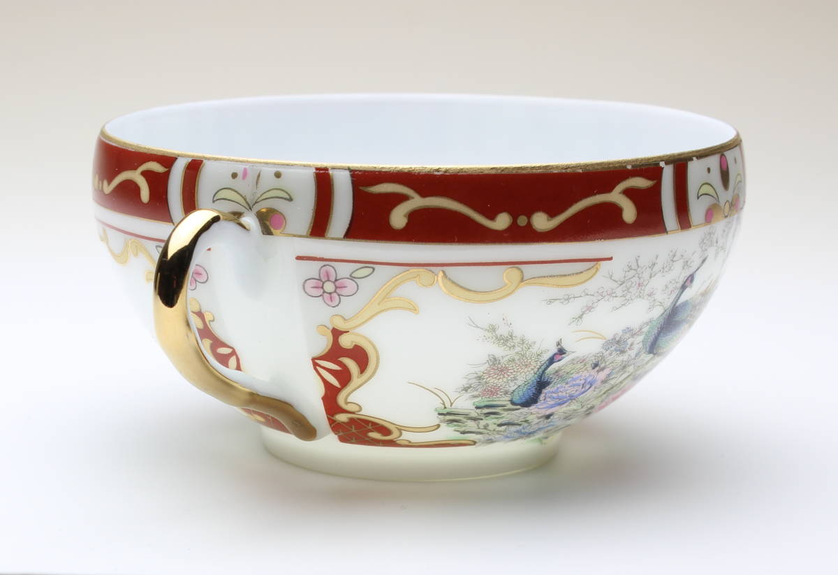 透かし芸者 磁器ティーカップ&ソーサー(中椀 小)絵柄: 孔雀 赤