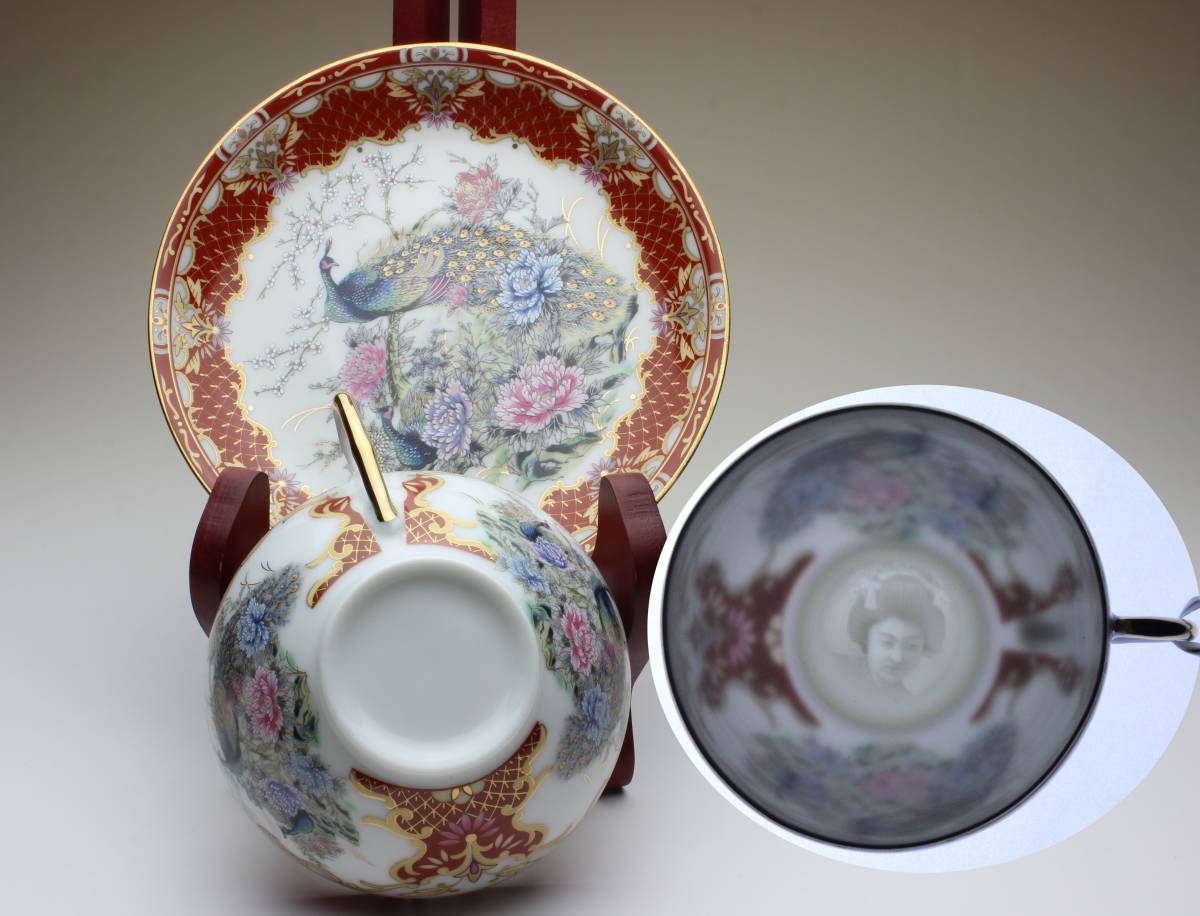 カップの底を光にかざすと、かわいい芸者さんのポートレート が浮かび上がります。カップ 中椀 サイズ: 直径 8.5 ㎝ x 高さ 4.5 cm (満水容量 160㏄)
