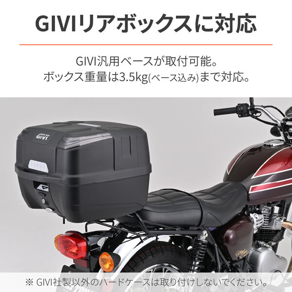 | ●ボディラインに沿ったパイプワークのクラシックなデザインのキャリア。キャリアの天面をタンデムシートと近付けることで大きな荷物を積載しやすくしました。他に部品を買い足すことなく、デイトナ社サドルバッグサポートとの同時装着が可能です。最大積載量は長年使用しても壊れない安心安全な設定です。 ■適合車種 W230 / MEGURO S1 ('25 8BK-BJ230A) ■仕様 ・カラー:ブラック ・素材:スチール ・最大積載重量:5kg ・メインパイプ部:Φ19.1 ・積載部寸法:長さ200×幅(前)195×幅(後)135(mm) ・取り付け可能なボックス:GIVI モノロックケース(重量3.5kg以下) ※GIVI モノロックケースのみ使用可能です。それ以外のトップケースはキャリア破損の可能性があるため取付不可。 ※取り寄せ品 |