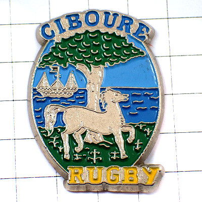 | "ピンバッジ・ラグビー球ボール銀色の馬や船シルバー緑の木 CIBOURE RUGBY FRANCE"の商品説明 | |