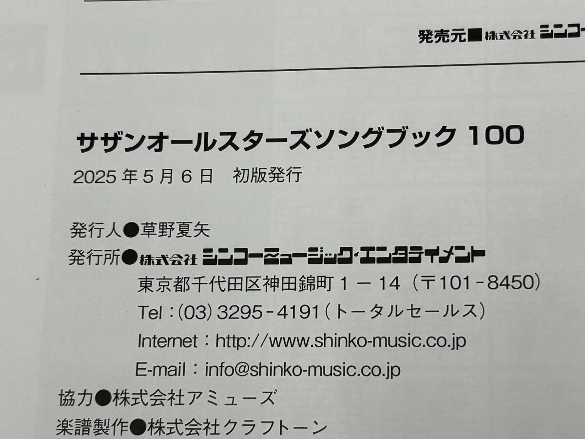 | 『サザンオールスターズ ソングブック100』2025年発行/シンコー・ミュージック/見開きで使えるコード+歌詞・全曲ギターダイアグラム付き | ||