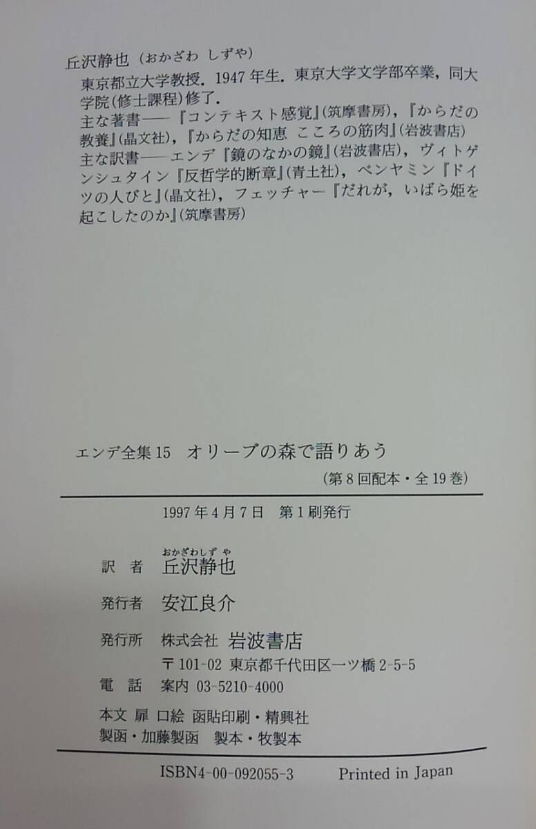 【丸-1403】エンデ全集15 オリーブの森で語り合う/ファンタジー・文化・政治/ 丘沢静也 訳/発行者 安江良介/岩波書店/第一刷発行(YS) |