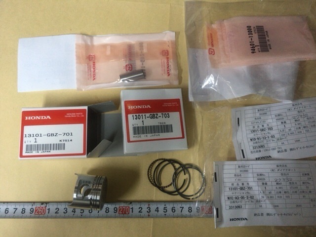 新品純正マグナ50 シリンダーピストン+リング セットホンダ純正 STDです。送料別 (1)ピストン 13101GBZ701 640 2635円1個 (2)ピストンリングセット 13011GBZ703 2343円 1個 (3)ピン ピストン 13111GB2000 1個 432円 1個 (4)ピストンピンクリップ 94601-13000 33円 2個 (5)シリンダー 12101-GS3-000 13445円 1個 (6)ガスケットシリンダー 12191-GB0-911 440円 1個 (7) シリンダーヘッドガスケット 12351-GBJ-003 1242円 1個 +送料です。 組み付ける時 オイルを 塗布したり 軽くクランキングしたりして ください。ノークレームノーリターンでお願いします。ゆうパックでお送りします。