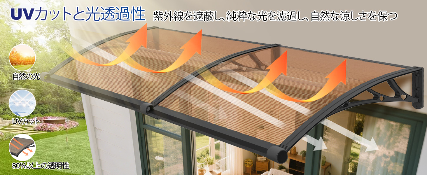 耐久性の高い構造:二層構造のポリカーボネートパネルが、パティオ・オーニングの安定性を高め、玄関ひさしや窓雨除けに最適な耐候性を実現します。強化ポリマー製のサポートフレームが、後付けドア・オーニング窓の雨よけの構造的完全性を確保し、ベランダ屋根テラス屋根カーポート屋根として長年にわたるメンテナンスフリー運用を可能にします。