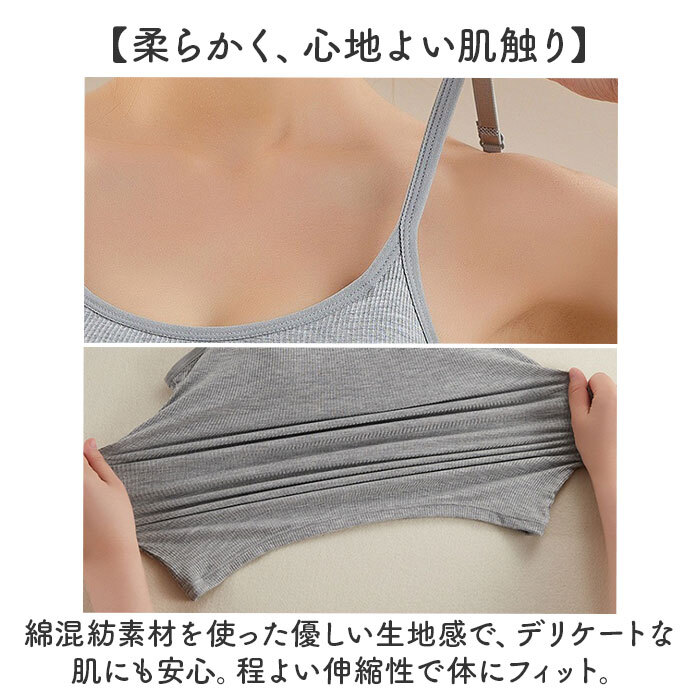 | 商品説明 | ・・【ストレスなく着こなせるアイテム】 ・締め付けがなくリラックス♪ブラとキャミソールが一体になった「ブラトップ」。 ・【トップが目立ちにくいパッド付き】 ・ソフトな立体カップを装備。窮屈さを感じず、負担もかからない!バストを優しくサポート。 ・(※)縫い付けられているため、取り外しはできません。ストラップは長さ調節可能です。 ・【柔らかく、心地よい肌触り】 ・綿混紡素材を使った優しい生地感で、デリケートな肌にも安心。程よい伸縮性で体にフィット。 ・【デコルテもすっきりキレイ魅せ】 ・深めに開いたネックライン。女性らしさが際立ち、ネックレスも映える♪ ・【色んなシーンで使えて万能】 ・装飾のないシンプルな仕上がり。インナー使いやルームウェアなどとしても活躍。 |
