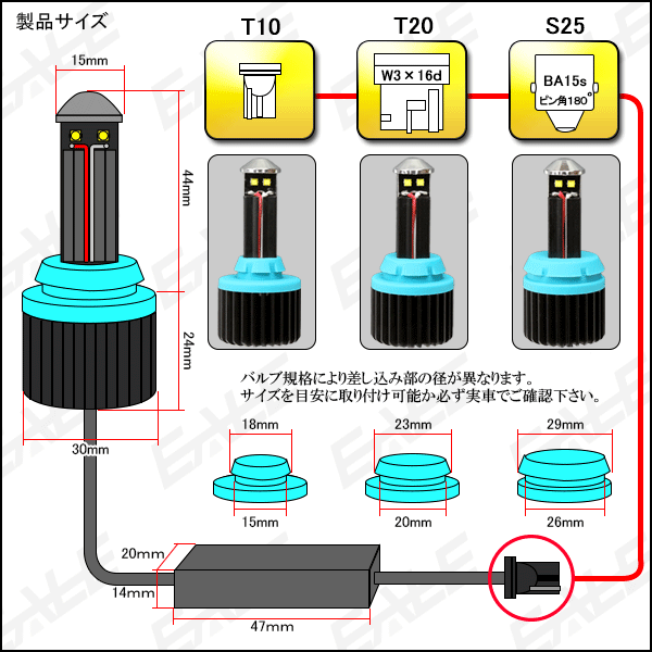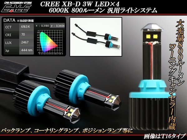 CREE XB-D 3W-LED4基 6000K 800ルーメン 汎用ライトシステム ライトキットです。 既存のバルブソケットと入れ替えるだけの簡単取り付け! バルブ交換では得られない、800ルーメンもの大光量でポジションランプ、バックランプ、コーナーリングランプ等、さまざまな用途にご使用頂けます。 球切れキャンセラー付きで国産車~輸入車まで幅広く対応します。 出品はT16タイプです。他の規格は⇒ こちら 実消費電力約9Wです。ワーニングキャンセラー内蔵型ですが、輸入車に取り付けた場合、車種により球切れ警告灯が点灯する場合がございます。 バルブ規格により、差し込み部の径が異なります。必ずサイズをご確認頂き、車輌に取り付け可能かご判断をお願いします。 |