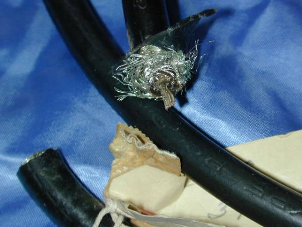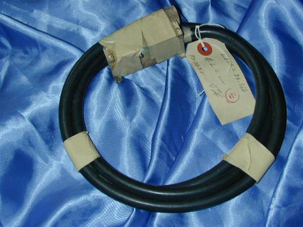| 50年代初期のウエスタンエレクトリックの極太ケーブルです。ケーブルの長さ約1.5メートル、被覆の直径はなんと11ミリもあります。12GA撚り線にゴム、ダブルのシールドさらにゴムのような被覆です。 1コンダクターです。 |