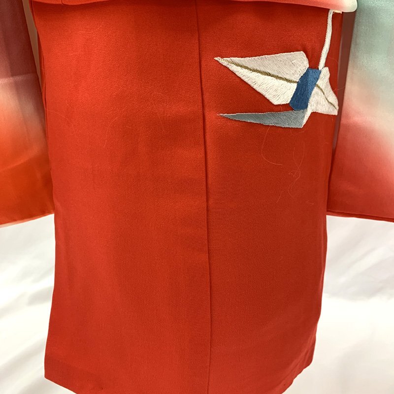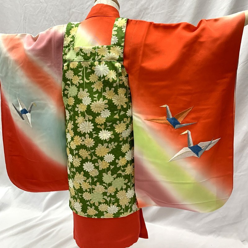 | □七五三 三歳 女児 着物&被布ワンピース&長襦袢 総刺繍 折り鶴 赤朱水色など□美品 (No.fd) *こちらの商品は着物&被布ワンピース&長襦袢です。(その他の付け衿、ヘッドピース、ブーツはセットに含まれません) 赤や朱色、淡い水色、くすみ紫、黄緑などのグラデーション地に、総刺繍の折り鶴が可愛らしい七五三3歳のお着物セットです。 (着物)一つ身のお着物です。左衽の一部に、うっすらシミがございますが近くで見ないと分からない程度です。 (長襦袢)袖丈の合うものをおまけでおつけいたしますが、中古品のためシミ汚れがある場合がございます(素材はお選びいただけません)。 (被布)ハンドメイドの被布ワンピース。着なくなった中古品の化繊の着物をリメイクしたハンドメイド品です。ハンドメイド品ですので、完璧を求める方はご遠慮ください 【表地素材】(着物)正絹、(被布)化繊 【色】赤、朱、淡い水色、黄緑など *モニターによって色味は実際と異なる場合がございます。 【サイズ】(着物) 裄:40cm、肩上げ幅:2.7cm、袖幅:28cm、袖丈:56cm、丈(肩から):97cm、腰上げ幅:0cm、前幅:14.5cm、後幅:16cm (被布) 幅:34cm、丈(肩から):44.5cm *素人採寸のため、多少の誤差はご容赦ください。 七五三後は、お正月やお節句などにもいいですよ。お求め安い価格での出品ですので、いかがでしょうか? | |