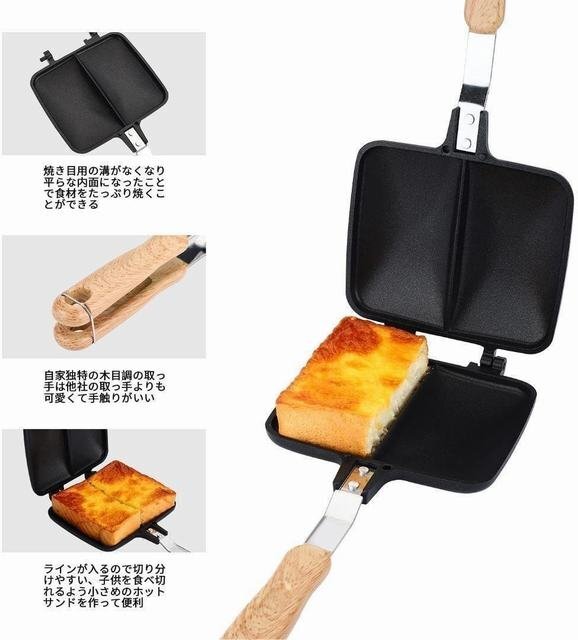 【サイズ】 :掲載サイズ表をご参照ください。 【直火OK】  フライパンのように使える直火式なホットサンドメーカーです。 自宅だけでなくキャンプやアウトドアなど、野外で使用できる点がポイントです。 朝食やおやつをサッと作りに便利な直火式はもちろん、キャンプ用のコンロやバーナーでもおいしいホットサンドを作れます。 家でもキャンプ場でも色んな美味しい料理に喜ばれるホットサンドです。 【上下分離型両面焼き】  上下の部分を分けて小型のフライパンとして使えます。 目玉焼きを作ったり、ソーセージを炒めたり、ホットサンドの具材をあらかじめ調理する際に便利です。 【ダブルタイプ】  真ん中仕切りになっています。 ふたりで半分づつ食べて2枚目は違う食材することもできます。ダブルタイプは耳のパリッとした食感が好きな人にピッタリ、ナイフが不要なうえ、小腹が満たせて受験生の夜食作りにも最適です。  【焦げ付きにくい】  フッ素加工を施し、焦げつきにくく、汚れも落ちやすいです。
