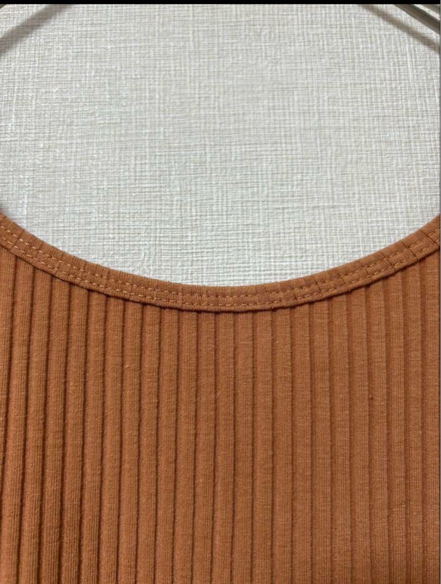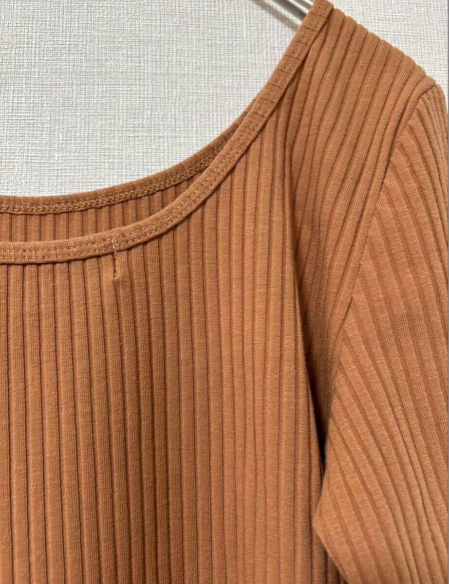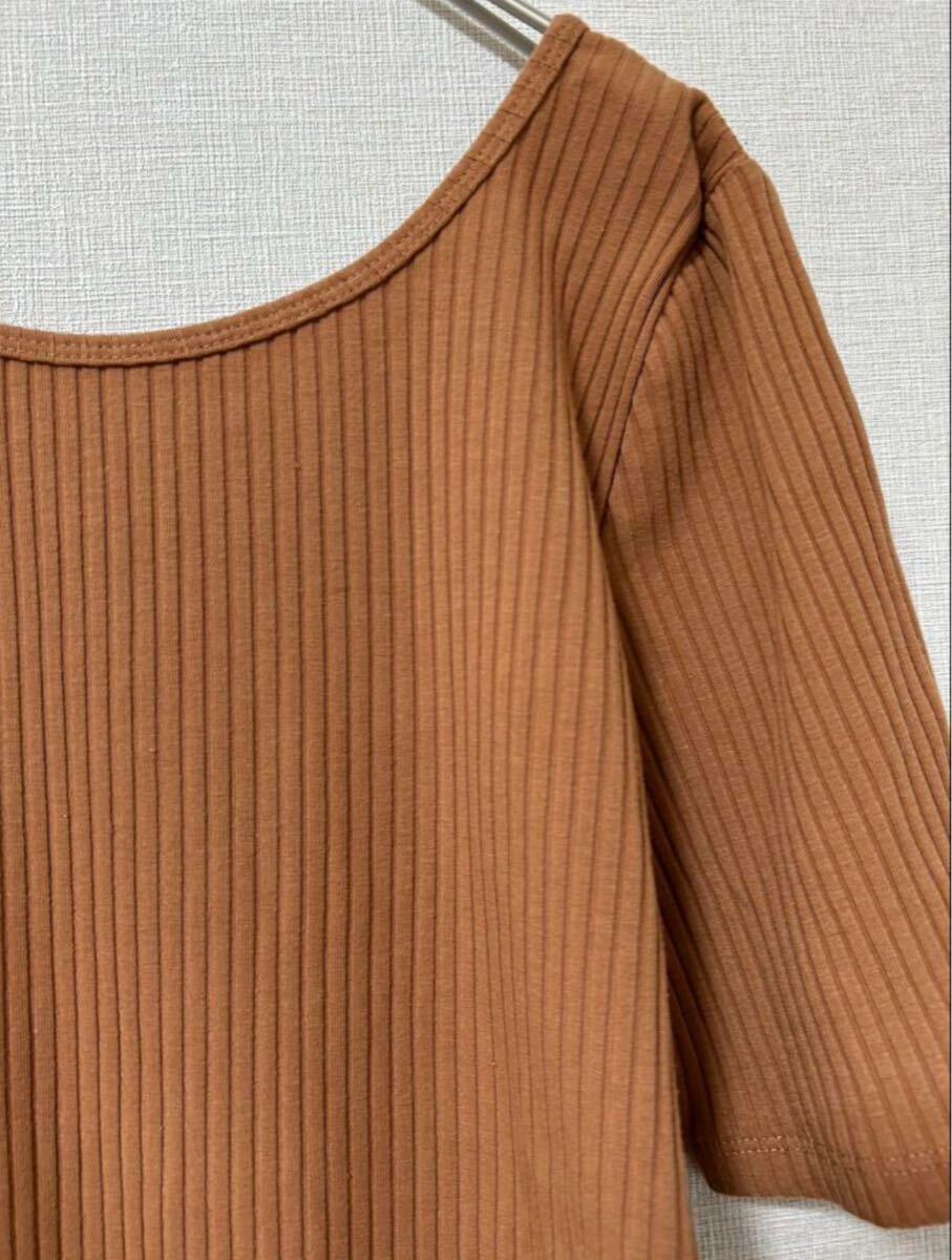 リブ編みのブラウン五分袖トップス、ワンサイズ。
