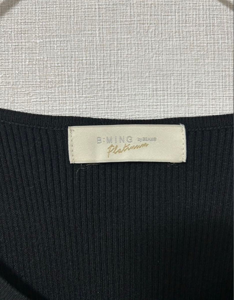 シンプルなブラックのVネック長袖ニット、波形裾デザインが特徴。