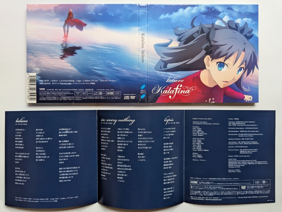 TVアニメ Fate/stay night EDテーマ「Kalafina believe [DVD付 期間生産限定アニメ盤]」中古品になります。画像のものがすべてです。ディスクの状態は良好だと思いますが、ケースには少し薄い擦れがあります。あくまでも中古品ですので神経質な方は入札をご遠慮ください。ご理解頂ける方のみご入札お願いします。発送方法は、スマートレター (※厚さ2cm以内)、レターパックライト(※厚さ3cm以内)、レターパックプラス、の中からお選びください。(※代金引換は対応しておりません。)素早くお取引を行える方を希望致します。オークション終了後、5日以内に入金できる方のみご入札お願いします。落札後のキャンセルはお断りします。評価の悪い方や、連絡が遅い方は入札をご遠慮ください。落札後はノークレーム、ノーリターンでお願いします。
