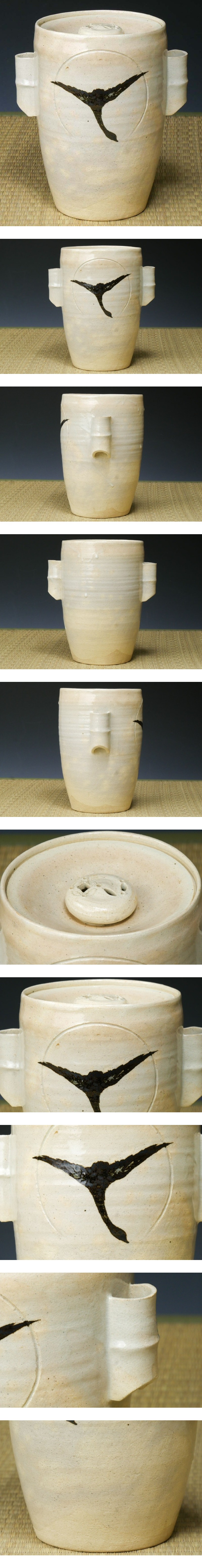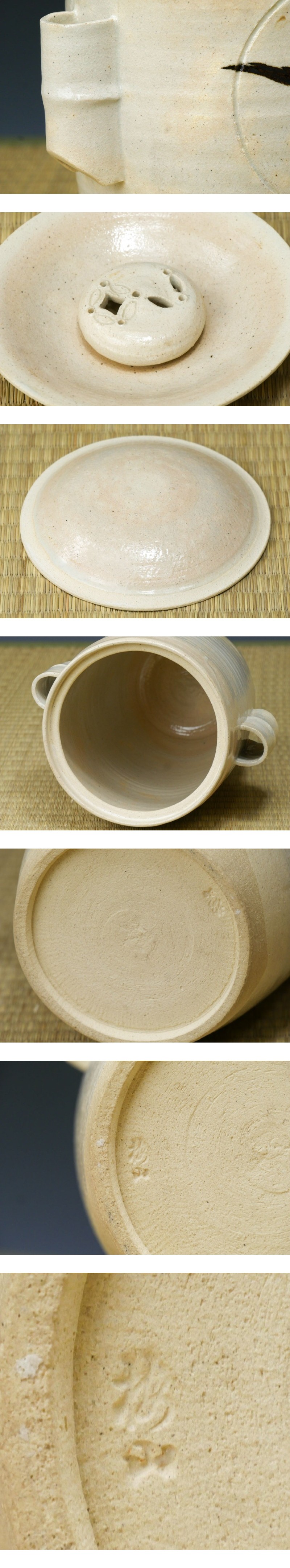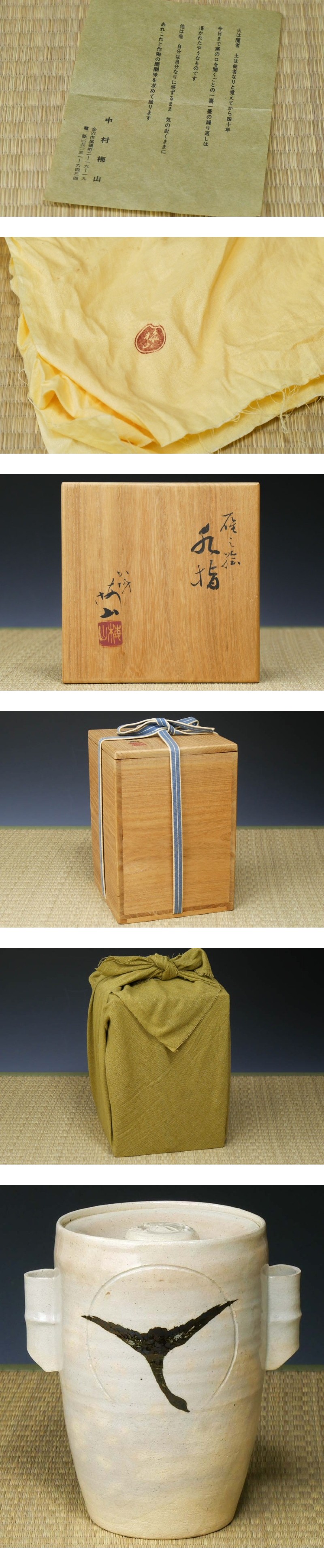 耳付が竹節で正面に月に雁の絵が有ります。加賀焼の名工中村梅山の作品です。棚の中に10月の中置にも使えます。
