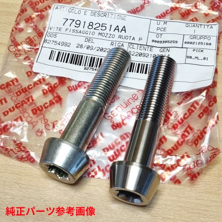 | ■ 商品構成 ●ドゥカティ対応パーツナンバー ① スイングアーム ピンチ ボルト x 1個 77918251AA 上記1パーツの製品構成です。 ※複数購入をご希望の方は、購入時に数量を指定してください。 オークションシステム上出品数量の最大個数が9個ですので、 10個以上必要な方はお申し付けください。 ■ 商品説明 ※関連製品 52-A番 - ディスクボルト 52-B~E番 - アクスルシャフト 8-A、52-F番 - リアスプロケットナット 52-G-1~4番 - スイングアームピンチボルトシリーズ 135-A~G番 - ブレーキ/クラッチマスターパーツ ※互換車種 ドゥカティ MONSTER 1200/R/S 2014~21 SUPER SPORT 939/S 2017~20 SUPER SPORT 950/S 2021~ X-DIAVEL/S 2016~23 DIAVEL 1260/S 2020~23 ■ 製作ストーリー チタン合金中空加工ボルトです。 ドゥカティモンスター1200 スイングアームピンチボルト用に製作しました。 このパーツを最後に、ドゥカティプロアームピンチボルトシリーズの製作をすべて終えることになりました。(52-G-1~4番) 写真の純正パーツは新品なので綺麗ですが、 純正ボルトは道路の土ぼこりや塩化カルシウム、ブレーキ粉塵などで、少し時間が経ってもすぐに錆びてしまうパーツです。 本製品に交換する際、バイクボルトとしては比較的大型サイズのパーツであり、 交換後すぐに目に見える場所に位置する理由で装着時の満足度が高い製品です。 純正と同じ工具サイズのT60ヘクスレンチで着脱が可能です。 最終仕上げ工程まで丁寧に仕上げ、 柔らかく豊かなチタン本来の色味を表現できるように図りました。 純正ボルトに比べて中空加工をより大型化し、GPバイクのような迫力あるビジュアルと従来ボルトに比べて半分以下の軽量化を図りました。 簡単なパーツの交換だけで、バイクの最重要最終駆動系統から約35グラムの重さを永久に取り除くことができます。 素材はチタン合金のTi-6Al-4V、通称64チタン(グレード5)を使用しています。 優れた強度、耐食性、耐熱性の素材で該当パーツとしっかり結合され、最上の性能が期待できます。 バイクの下部軽量化によりバイクの性能特性(ハンドリング、加減速力)も向上します。 また錆びない素材なので、何年経っても元の発色のままでバイクの品位を高めます。 チタンパーツは一般的にカーレースによく使われるパーツですが、 馬力比軽量なバイクに使用すると、そのポテンシャルが極大化されるパーツだと思います。 ぜひその性能を体感してみてください。 ドゥカティモンスター1200用に製作しましたが、ドゥカティバイク多数に互換できます。 互換車種のリストを添付します。 でも、確実にするために、購入前にご本人のバイクタイプと互換性があるかどうかをもう一度確認お願いします。 | |||||