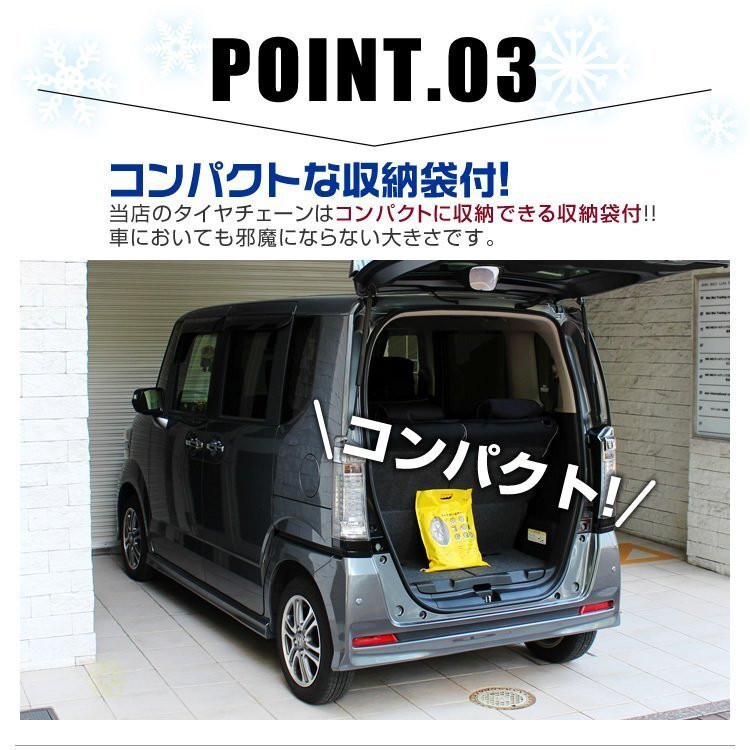 | 冬の必需品、タイヤチェーンです。 ジャッキアップ不要で取り付けが簡単です! 亀甲タイプで横滑りしにくい! 細い9ミリになってタイヤと車体の隙間が狭い車に適応! コンパクト収納(トランク内でもすっきり収納!) |