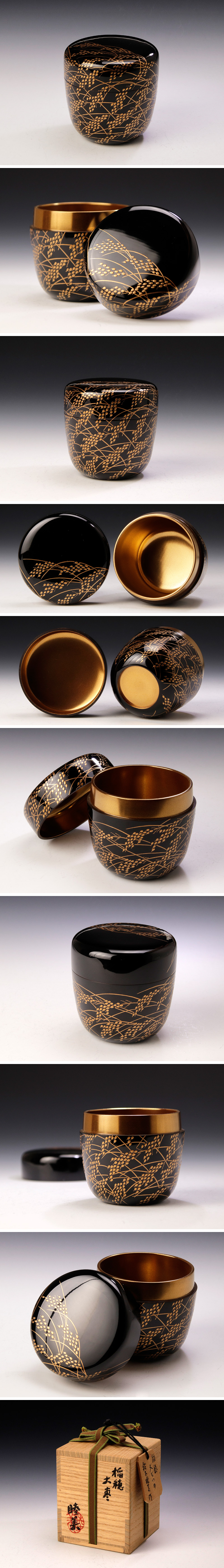 艶やかな黒塗りの艶面に、たわわに実った稲穂が蒔絵で描かれたこの棗は、豊穣を象徴する意匠の華やかさと、細密な筆致が生む上品な輝きが調和した、席を格上げする存在感ある逸品です。 ★商品は鈴木睦美の作品である事を保証致します。 |