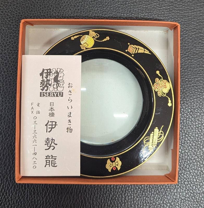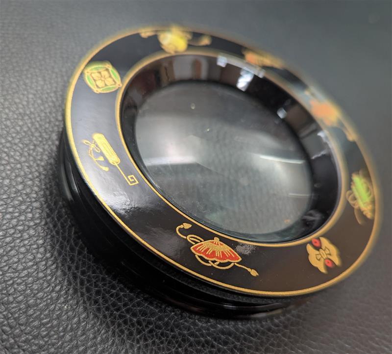 | #13180B 伝統工芸 工芸品 山中塗 宝づくし 漆芸 金彩 拡大鏡 ルーペ レトロ コレクション 箱付 | ||