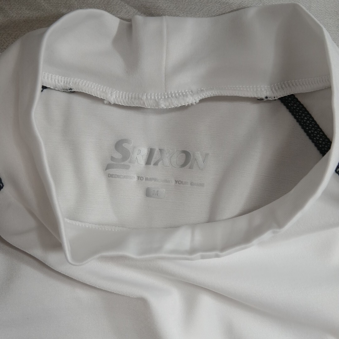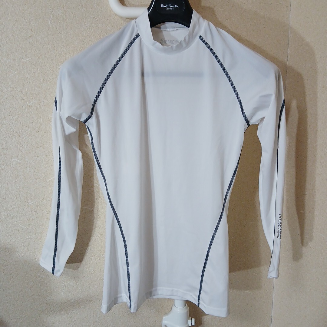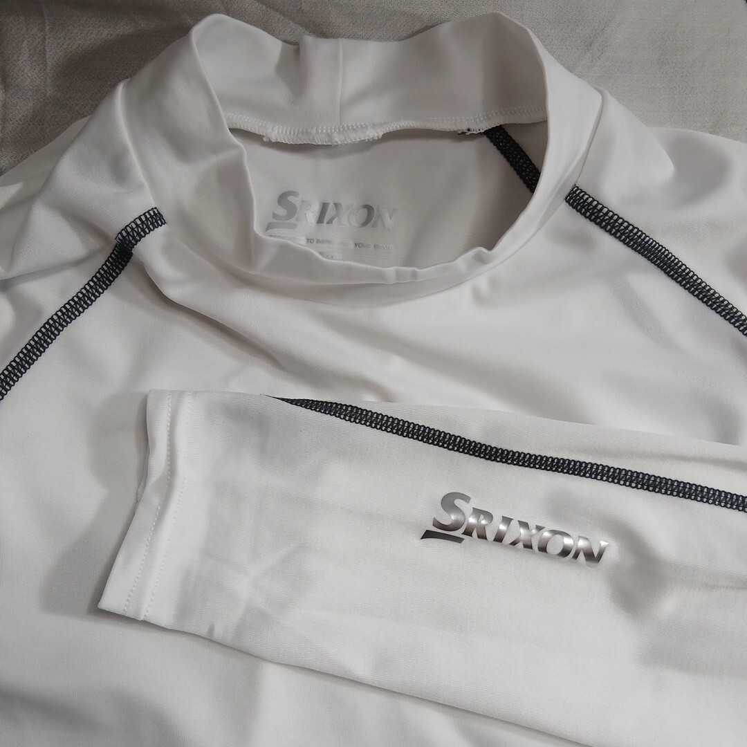スリクソン(ダンロップ)のハイネックアンダーです。サイズはMで、身長165~175センチ、チェスト88~96センチです。素材は、ポリエステル80%、ポリウレタン20%です。色は、ホワイトです。未使用ですが自宅保管品です。