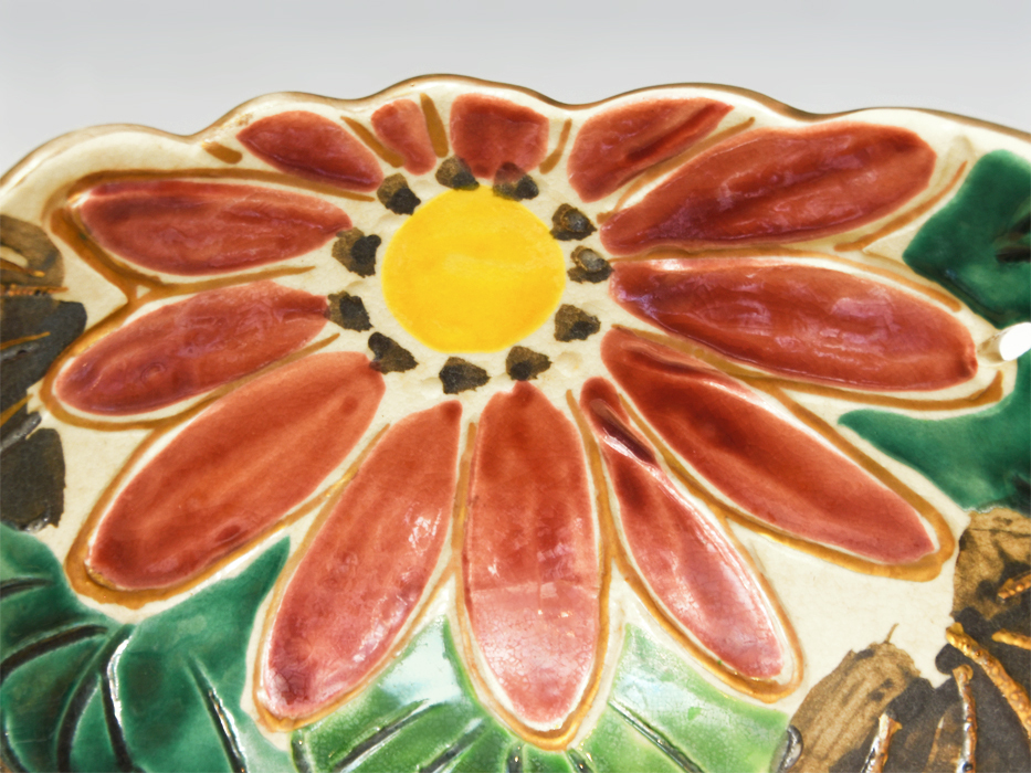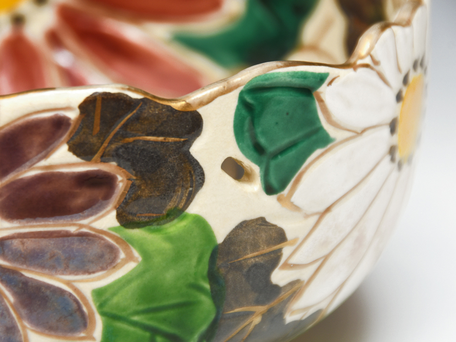 平安萬珠堂 (造) 着彩菊画 菓子鉢です。 色鮮やかな菊が施された一品です。 底部に銘あり。 ダメージなくコンディション良好です。 ※撮影の際に生じた写り込みなどがございます。 ご理解の程よろしくお願い致します。 |