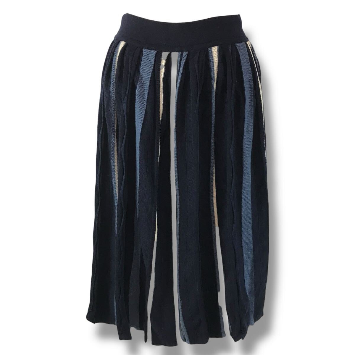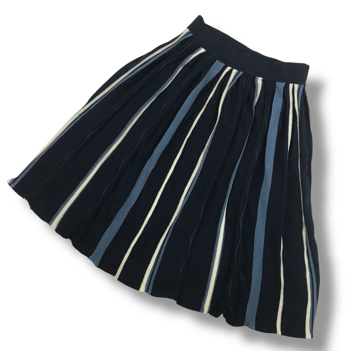 e75 Salvatore Ferragamo サルヴァトーレフェラガモ ニット プリーツスカート ストライプ ネイビー ブルー S イタリア製 毛90% 膝丈 正規品