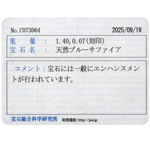 | 石目 | サファイア1.40ct ダイヤモンド0.07ct |