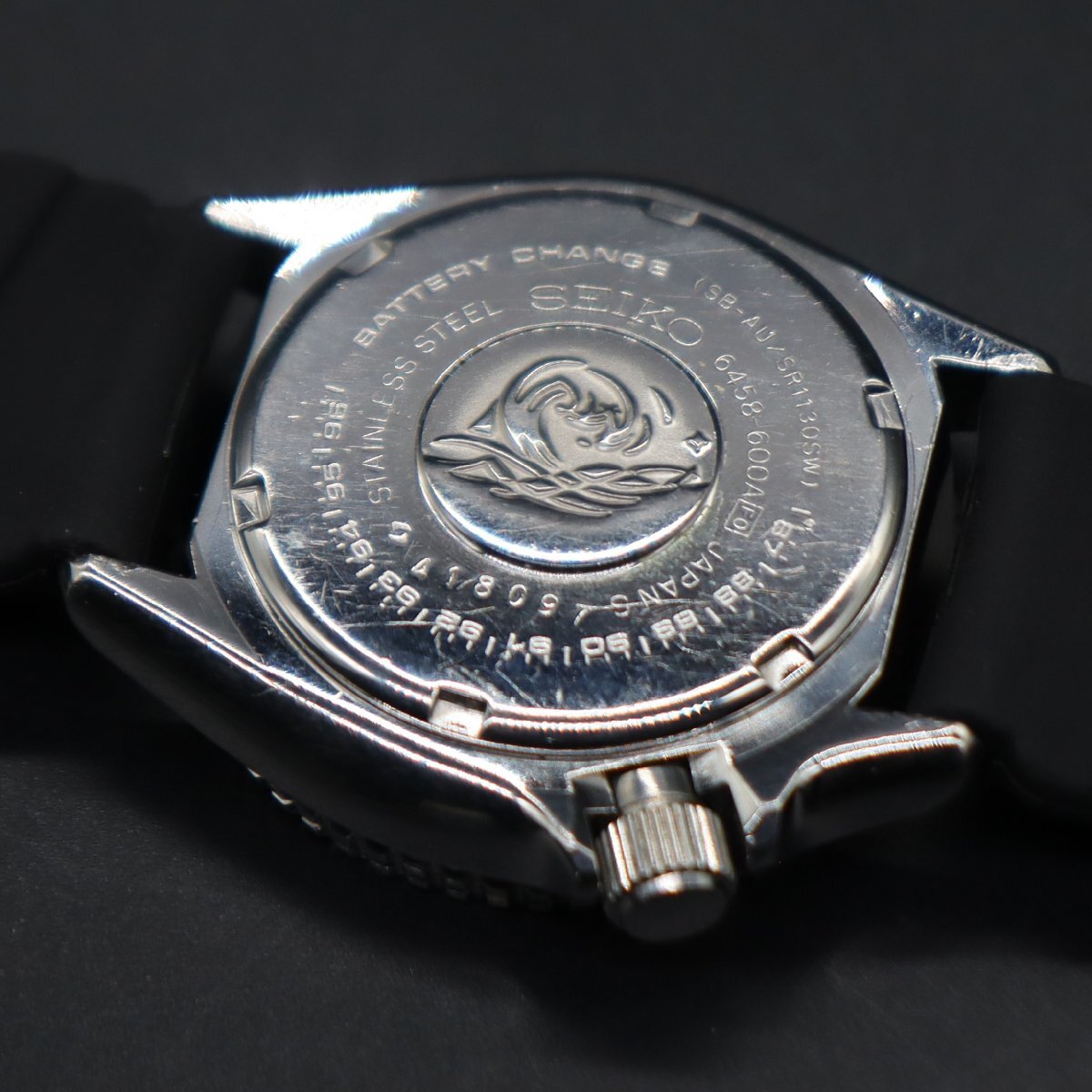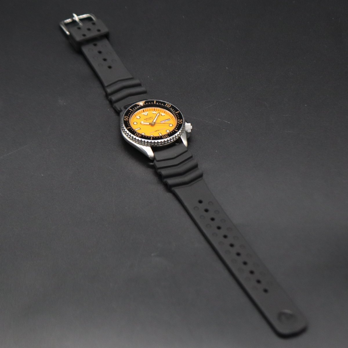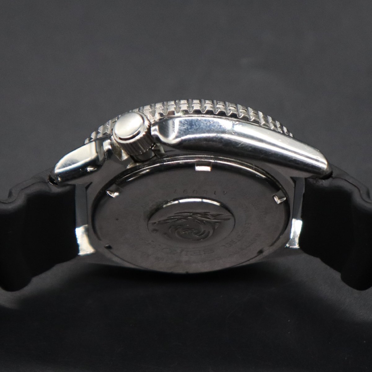 平置きで24時間動作確認済み、遅れなく稼働中です。 電池残量は不明です。 ねじ込み式リューズをほどき、 リューズを一段引きでデイデイト クイックチェンジOK、 二段引きで時刻調整が可能です。 ベゼルを含む全体に使用に伴うキズ・小打痕、 小汚れございますが、風防は目視で目立つキズなく良好です。 文字盤・針・インデックス、いずれも良い状態です。 プリントロゴや印字、消えなく鮮明です。 夜光、薄く光ります。 ベゼル、回転スムーズです。 裏蓋に小キズございますが、波マーク・刻印、鮮明です。 ベルトは、新品のSEIKO社製ラバーベルトに交換済みです。 状態について、詳しくは画像にてご判断願います。 |