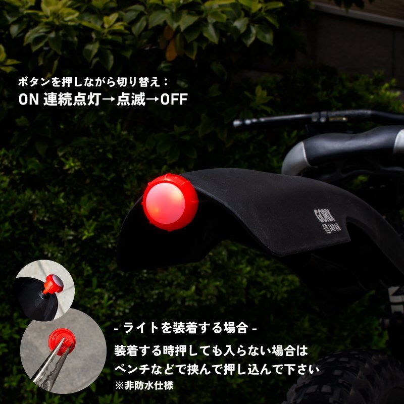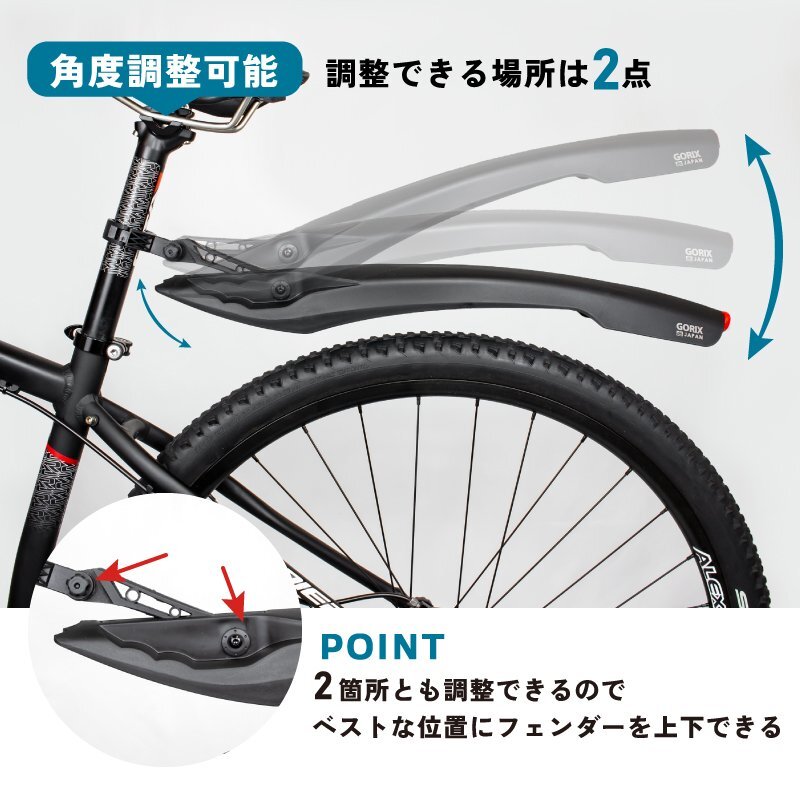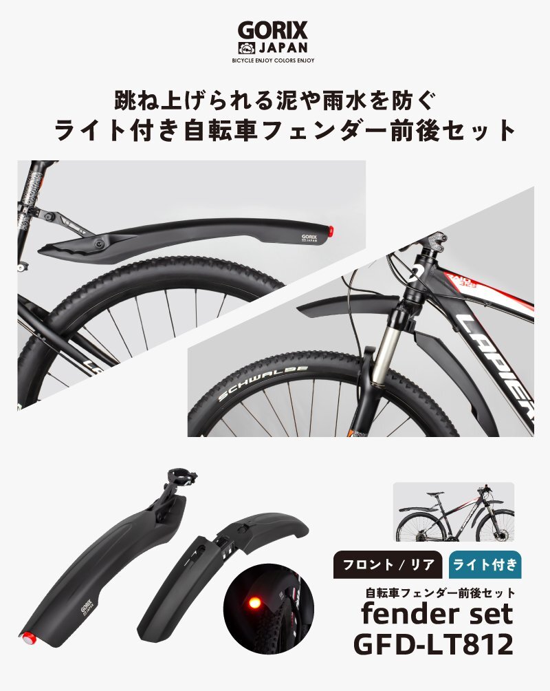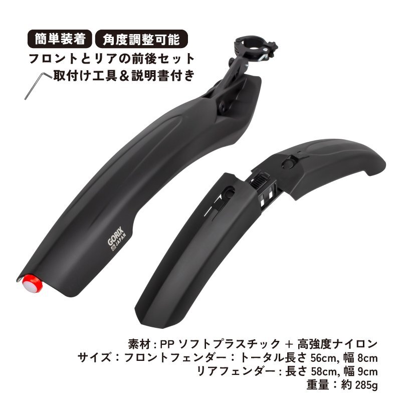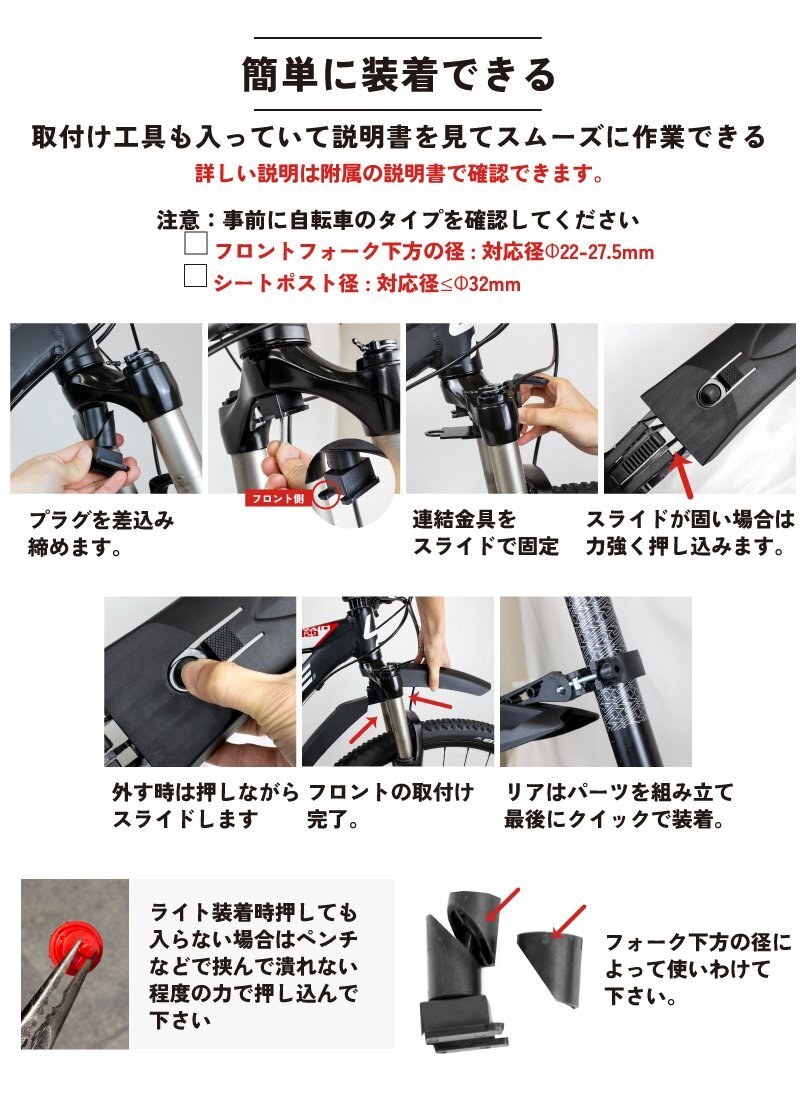 雨などの悪天候や路面がウェットの時に前輪や後輪から跳ね上げられる泥、雨水をお尻や背中にかかるのを防ぐアイテムです。 制服やスーツでの自転車通勤や自転車通学には是非装着したい泥除けです。 衣服やリュックを汚さず雨上がりでも安心して乗れるようになりますね。 梅雨の季節で最も活躍するフェンダー。 幅広いのでタイヤの太いMTBマウンテンバイクに最適な自転車用泥よけです。 [幅広くガード] タイヤの太いMTBに合わせやすい幅広の約8cm。 幅広い事でカードする範囲が広くなり泥はねをガード。 [角度調整可能] リアフェンダーは上下に角度調整ができます。 2カ所で調整できるので自転車にとってベストな位置を導けます。 [破損しにくい] 柔軟性ある高強度ゴム素材で曲げや折れに強い。 耐久性の良いゴム材料を採用し頑丈で丈夫、なので破損しにくい。 両端は柔らかくしなやかなソフトラバーで折れたり割れたりしない。 [リアライト] 暗闇で存在を示せるライトは夜間走行に。 後からの衝突リスクを減らせて安全に。 商品内容フェンダー前後セット、日本語説明書、工具 素材PPソフトプラスチック + 高強度ナイロン テールライトLR1130 1.5V電池内蔵※非防水仕様※ ボタンを押しながら切り替え:ON連続点灯→点滅→OFF サイズフロントフェンダー:トータル長さ56cm, 幅8cm リアフェンダー: 長さ58cm,幅9cm 重量約285g 注意事前に自転車のタイプを確認してください ▲フロントフォーク下方の径: 対応径Φ22-27.5mm ▲ シートポスト径 : 対応径?Φ32mm カラーブラック |