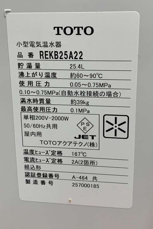■商品名TOTO REKB25A22 小型電気温水器(先止め式) 湯ぽっと 箱無し